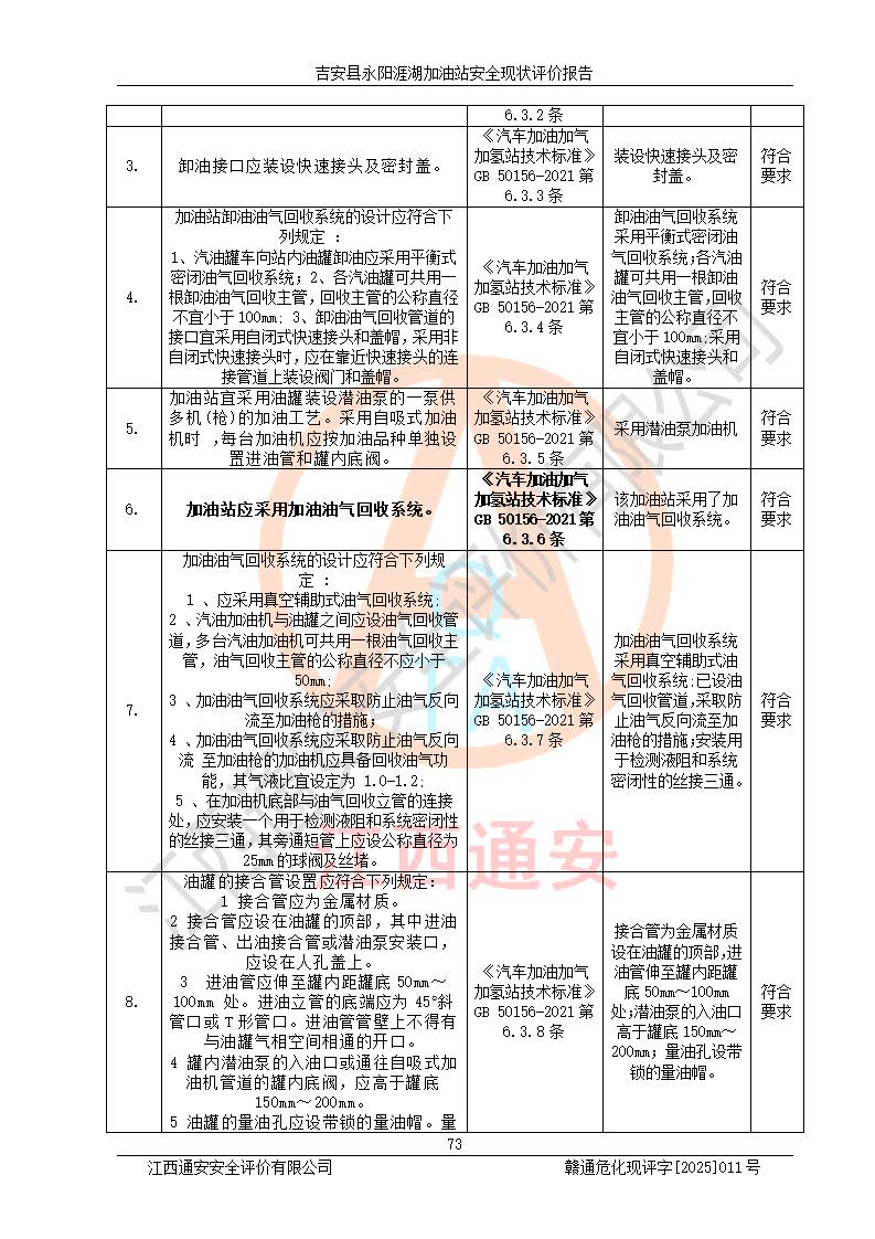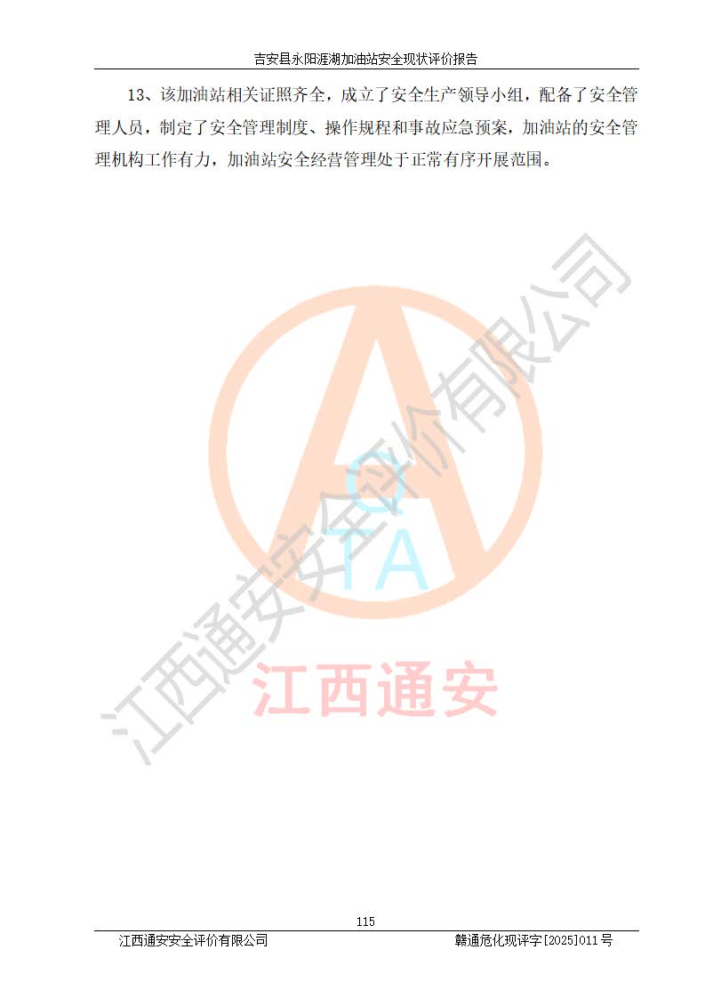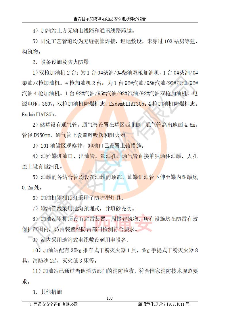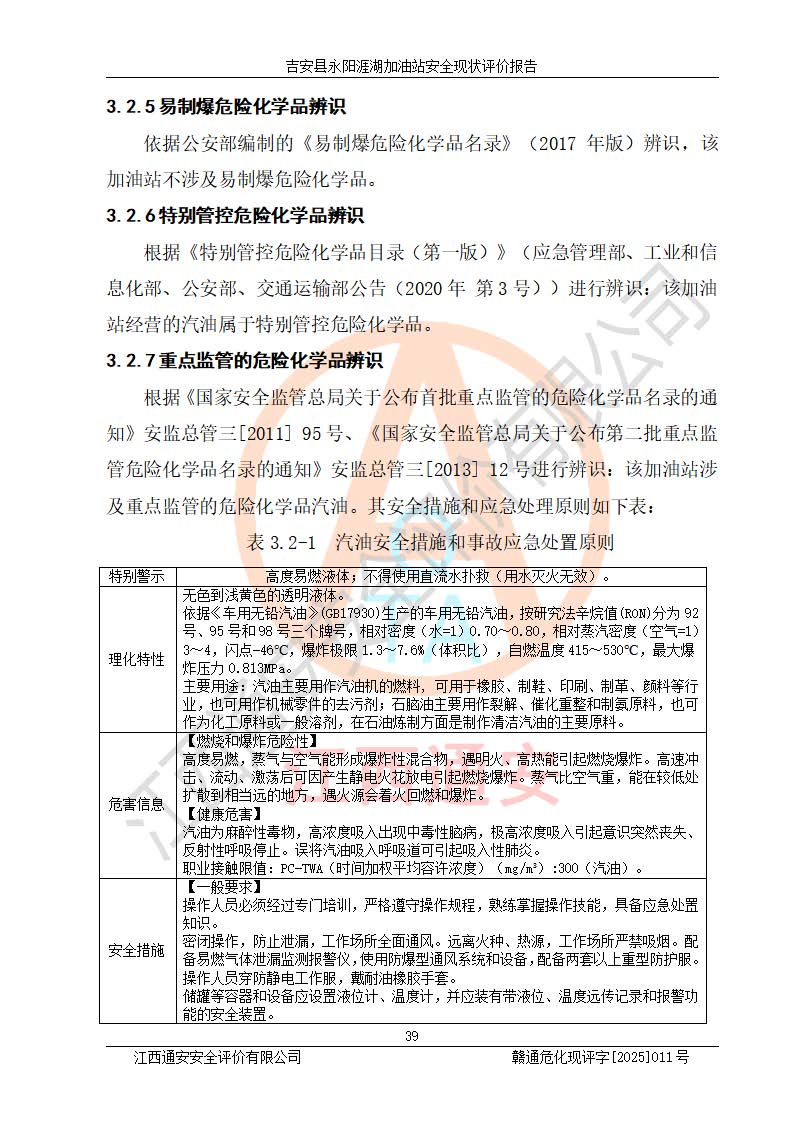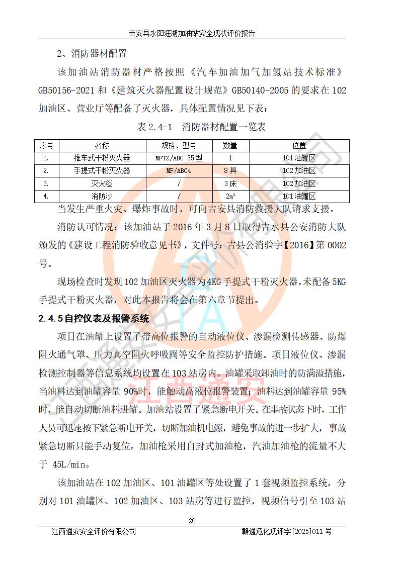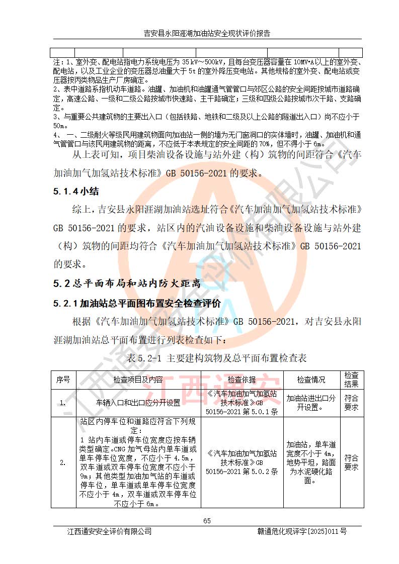項目簡介 | 吉安縣永陽涯湖加油站于2019年8月16日經(jīng)吉安縣市場監(jiān)督管理局核準注冊成立,營業(yè)場所位于江西省吉安市吉安縣永陽鎮(zhèn)涯湖村。類型:個人獨資企業(yè),投資人:張愛芳,營業(yè)執(zhí)照統(tǒng)一社會信用代碼為:91360821MA38RQ3152。營業(yè)執(zhí)照核準經(jīng)營范圍:成品油零售(依法須經(jīng)批準的項目,經(jīng)相關(guān)部門批準后方可開展經(jīng)營活動)。 吉安縣永陽涯湖加油站占地面積8648.6㎡,加油站中設(shè)有1臺0#柴油/0#柴油雙槍加油機、1臺0#柴油/0#柴油雙槍加油機、1臺92#汽油/95#汽油/92#汽油/92#汽油4槍加油機、1臺92#汽油/95#汽油/92#汽油/92#汽油4槍加油機布置;1臺30m30#柴油雙層埋地儲罐、1臺30m392#汽油雙層埋地儲罐、1臺30m395#汽油/92#汽油雙層分艙埋地儲罐(95#汽油和92#汽油各15m3),油品*大儲存能力為75m3(柴油罐容積折半計入油罐總?cè)莘e),屬三級加油站,汽油卸油、加油設(shè)置了油氣回收系統(tǒng)。 吉安縣永陽涯湖加油站于2022年4月1日經(jīng)吉安市應(yīng)急管理局核準,換發(fā)了新的《危險化學(xué)品經(jīng)營許可證》,證書編號:贛吉?;?/span>經(jīng)字[2022]360800000016號,許可范圍:成品油。**期2022年5月23日至2025年5月22日。 吉安縣永陽涯湖加油站2020年9月7日經(jīng)吉安市商務(wù)局核準,換取了新的《成品油零售經(jīng)營批準證書》,證書編號:油零售證書第吉0004號,批準從事成品油(汽油、柴油)零售業(yè)務(wù)。證書**期至2020年9月7日至2025年9月6日。 | ||||
