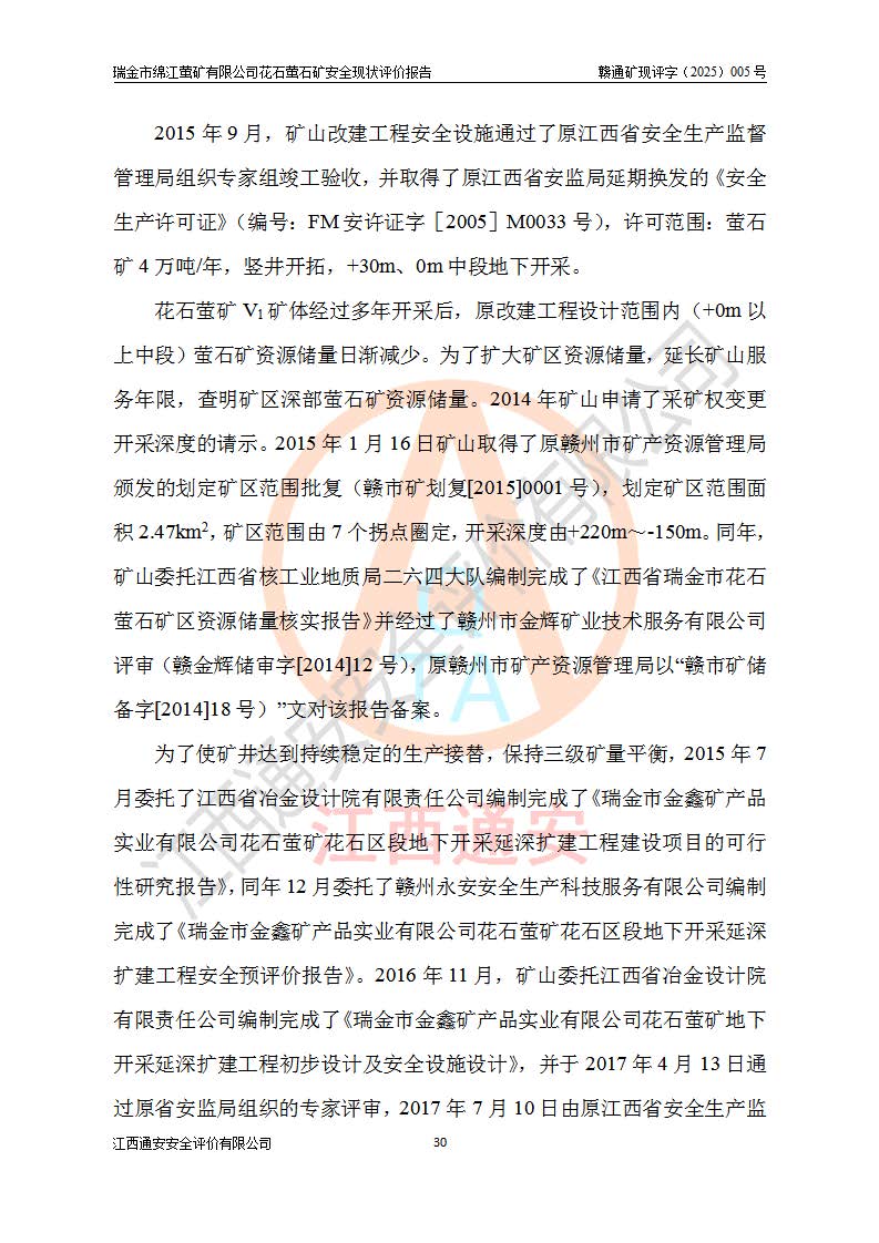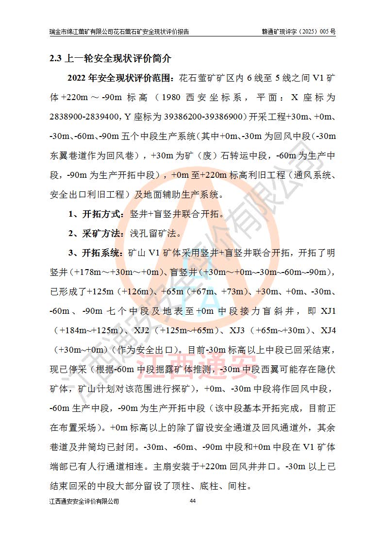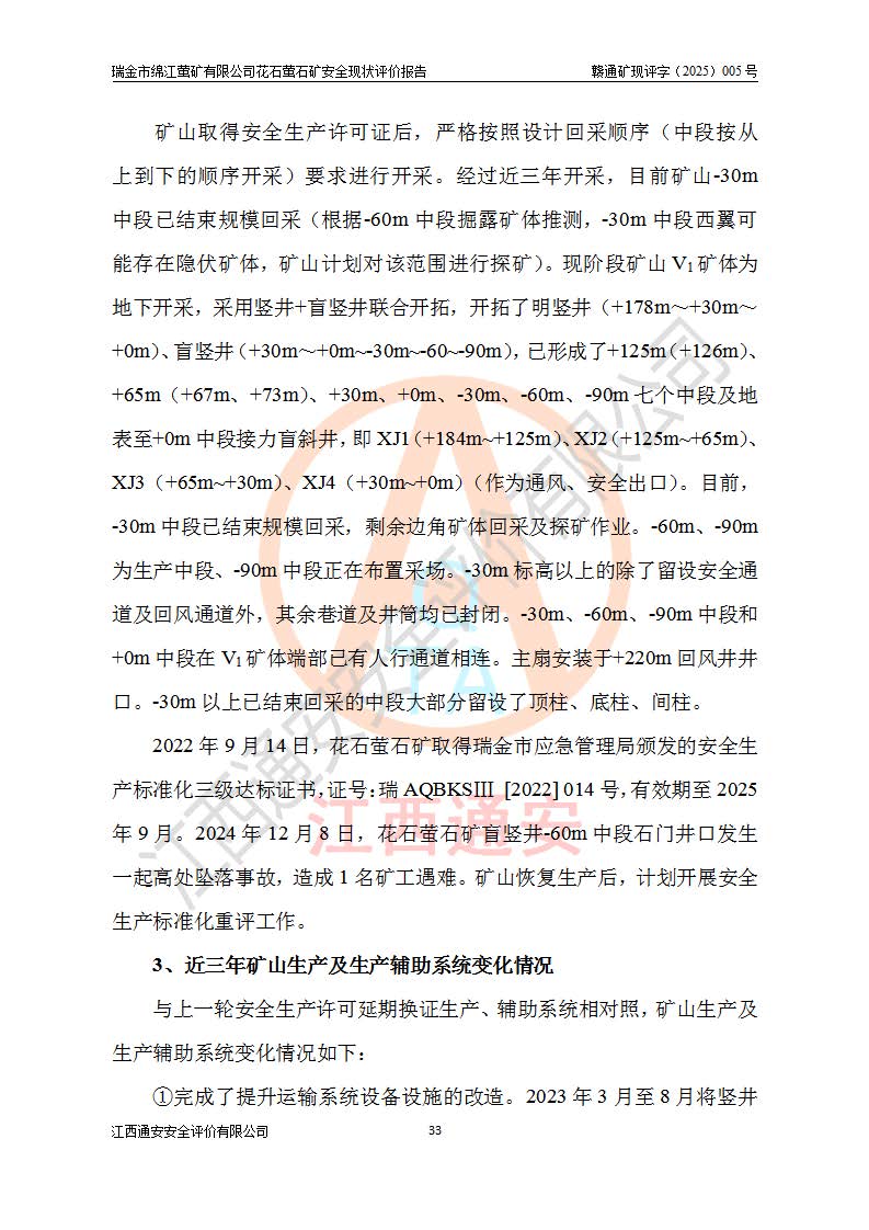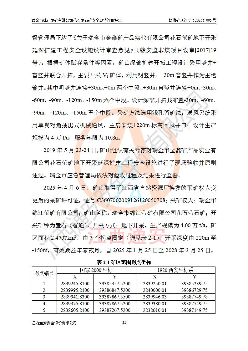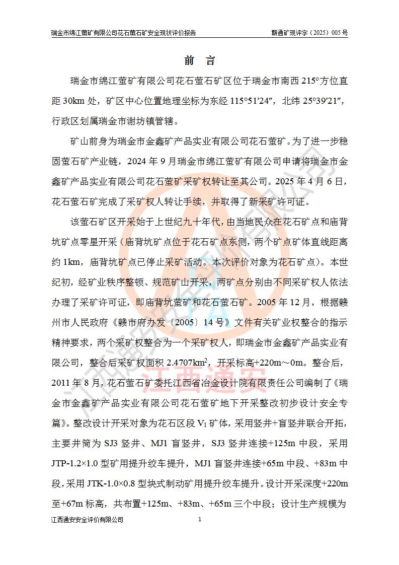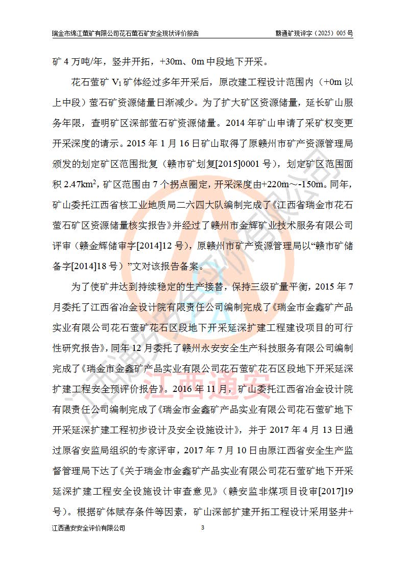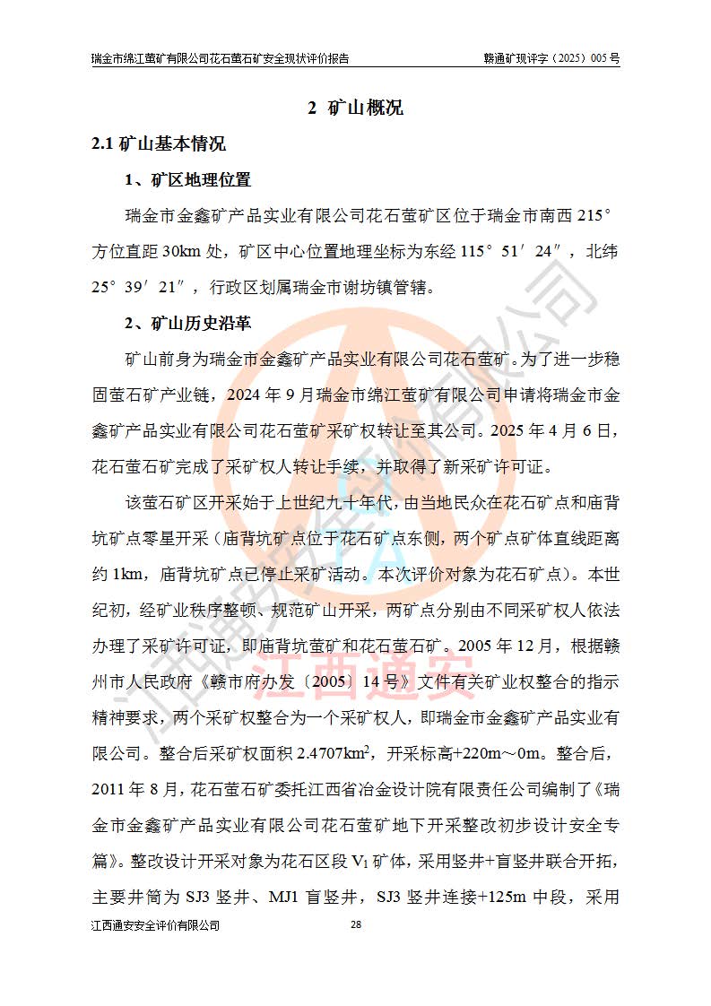 瑞金市綿江螢礦有限公司花石螢石礦區(qū)位于瑞金市南西215°方位直距30km處,礦區(qū)中心位置地理坐標(biāo)為東經(jīng)115°51′24″,北緯25°39′21″,行政區(qū)劃屬瑞金市謝坊鎮(zhèn)管轄。 礦山前身為瑞金市金鑫礦產(chǎn)品實(shí)業(yè)有限公司花石螢礦。為了進(jìn)一步穩(wěn)固螢石礦產(chǎn)業(yè)鏈,2024年9月瑞金市綿江螢礦有限公司申請(qǐng)將瑞金市金鑫礦產(chǎn)品實(shí)業(yè)有限公司花石螢礦采礦權(quán)**至其公司。2025年4月6日,花石螢石礦完成了采礦權(quán)人**手續(xù),并取得了新采礦許可證。 該螢石礦區(qū)開采始于上世紀(jì)九十年代,由當(dāng)?shù)孛癖娫诨ㄊV點(diǎn)和廟背坑礦點(diǎn)零星開采(廟背坑礦點(diǎn)位于花石礦點(diǎn)東側(cè),兩個(gè)礦點(diǎn)礦體直線距離約1km,廟背坑礦點(diǎn)已停止采礦活動(dòng)。本次評(píng)價(jià)對(duì)象為花石礦點(diǎn))。本世紀(jì)初,經(jīng)礦業(yè)秩序整頓、規(guī)范礦山開采,兩礦點(diǎn)分別由不同采礦權(quán)人依法辦理了采礦許可證,即廟背坑螢礦和花石螢石礦。2005年12月,根據(jù)贛州市人民**《贛市府辦發(fā)〔2005〕14號(hào)》文件有關(guān)礦業(yè)權(quán)整合的指示精神要求,兩個(gè)采礦權(quán)整合為一個(gè)采礦權(quán)人,即瑞金市金鑫礦產(chǎn)品實(shí)業(yè)有限公司,整合后采礦權(quán)面積2.4707km2,開采標(biāo)高+220m~0m。整合后,2011年8月,花石螢石礦委托江西省冶金設(shè)計(jì)院有限責(zé)任公司編制了《瑞金市金鑫礦產(chǎn)品實(shí)業(yè)有限公司花石螢礦地下開采整改初步設(shè)計(jì)安全專篇》。整改設(shè)計(jì)開采對(duì)象為花石區(qū)段V1礦體,采用豎井+盲豎井聯(lián)合開拓,主要井筒為SJ3豎井、MJ1盲豎井,SJ3豎井連接+125m中段,采用JTP-1.2×1.0型礦用提升絞車提升,MJ1盲豎井連接+65m中段、+83m中段,采用JTK-1.0×0.8型塊式制動(dòng)礦用提升絞車提升。設(shè)計(jì)開采深度+220m至+67m標(biāo)高,共布置+125m、+83m、+65m三個(gè)中段;設(shè)計(jì)生產(chǎn)規(guī)模為4萬噸/年,采礦方法選用淺孔留礦法。 根據(jù)整改設(shè)計(jì)要求,礦山經(jīng)過近一年多的整改施工,2012年9月通過由原贛州市安全生產(chǎn)監(jiān)督管理局組織的安全設(shè)施整改驗(yàn)收。2012年9月26日取得了由原江西省安全生產(chǎn)監(jiān)督管理局延期換發(fā)的《安全生產(chǎn)許可證》(編號(hào):FM安許證字[2005]M0033號(hào)),許可范圍:螢石礦4萬噸/年,豎井+盲豎井聯(lián)合開拓,+67m中段地下開采。 由于原整改設(shè)計(jì)范圍內(nèi)(+67m以上中段)V1礦體資源儲(chǔ)量無法使礦井達(dá)到持續(xù)穩(wěn)定的生產(chǎn)接替,根據(jù)2011年11月264核工業(yè)大隊(duì)《江西省瑞金市花石螢石礦資源儲(chǔ)量核實(shí)報(bào)告》及礦山提交的2013年度資源儲(chǔ)量動(dòng)態(tài)檢測(cè)報(bào)告。2013年4月,花石螢石礦又委托江西省冶金設(shè)計(jì)院有限責(zé)任公司為其編制了《瑞金市金鑫礦產(chǎn)品實(shí)業(yè)有限公司花石螢礦花石礦區(qū)地下開采改建工程初步設(shè)計(jì)安全專篇》。設(shè)計(jì)開采范圍+83m~+0m標(biāo)高;采用豎井開拓。設(shè)計(jì)新建開拓工程為新豎井及+83m、+40m、+0m三個(gè)中段。采礦方法為淺孔留礦法。 由于部分工程與設(shè)計(jì)不符。2014年10月,礦山委托江西省冶金設(shè)計(jì)院有限責(zé)任公司編制了《瑞金市金鑫礦產(chǎn)品實(shí)業(yè)有限公司花石螢礦花石礦區(qū)地下開采改建工程變更設(shè)計(jì)》,其中段布置變更為+30m、+0m中段;通風(fēng)系統(tǒng)變更為以新豎井為進(jìn)風(fēng)井;采用SJ3北東已有的平峒(PD)及平硐內(nèi)的人行、回風(fēng)斜巷MXJ1、MXJ2 、MXJ3并配置相關(guān)工程后作為礦區(qū)北東翼礦體開采的北東翼回風(fēng)系統(tǒng)。主扇安裝于+190m中段回風(fēng)道。 2015年9月,礦山改建工程安全設(shè)施通過了原江西省安全生產(chǎn)監(jiān)督管理局組織專家組竣工驗(yàn)收,并取得了原江西省安監(jiān)局延期換發(fā)的《安全生產(chǎn)許可證》(編號(hào):FM安許證字[2005]M0033號(hào)),許可范圍:螢石礦4萬噸/年,豎井開拓,+30m、0m中段地下開采。 花石螢礦V1礦體經(jīng)過多年開采后,原改建工程設(shè)計(jì)范圍內(nèi)(+0m以上中段)螢石礦資源儲(chǔ)量日漸減少。為了擴(kuò)大礦區(qū)資源儲(chǔ)量,延長(zhǎng)礦山服務(wù)年限,查明礦區(qū)深部螢石礦資源儲(chǔ)量。2014年礦山申請(qǐng)了采礦權(quán)變更開采深度的請(qǐng)示。2015年1月16日礦山取得了原贛州市礦產(chǎn)資源管理局頒發(fā)的劃定礦區(qū)范圍批復(fù)(贛市礦劃復(fù)[2015]0001號(hào)),劃定礦區(qū)范圍面積2.47km2,礦區(qū)范圍由7個(gè)拐點(diǎn)圈定,開采深度由+220m~-150m。同年,礦山委托江西省核工業(yè)地質(zhì)局二六四大隊(duì)編制完成了《江西省瑞金市花石螢石礦區(qū)資源儲(chǔ)量核實(shí)報(bào)告》并經(jīng)過了贛州市金輝礦業(yè)技術(shù)服務(wù)有限公司評(píng)審(贛金輝儲(chǔ)審字[2014]12號(hào)),原贛州市礦產(chǎn)資源管理局以“贛市礦儲(chǔ)備字[2014]18號(hào))”文對(duì)該報(bào)告?zhèn)浒浮?/span> 為了使礦井達(dá)到持續(xù)穩(wěn)定的生產(chǎn)接替,保持三級(jí)礦量平衡,2015年7月委托了江西省冶金設(shè)計(jì)院有