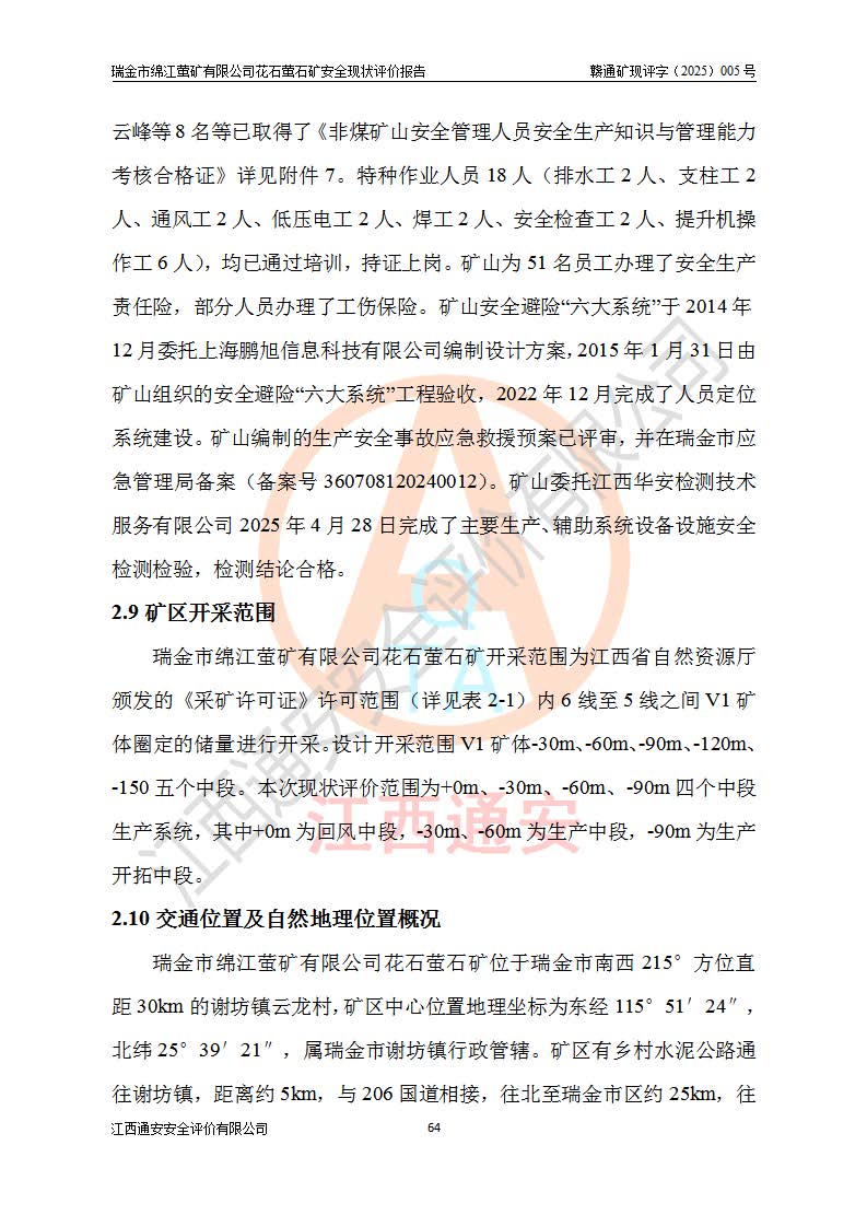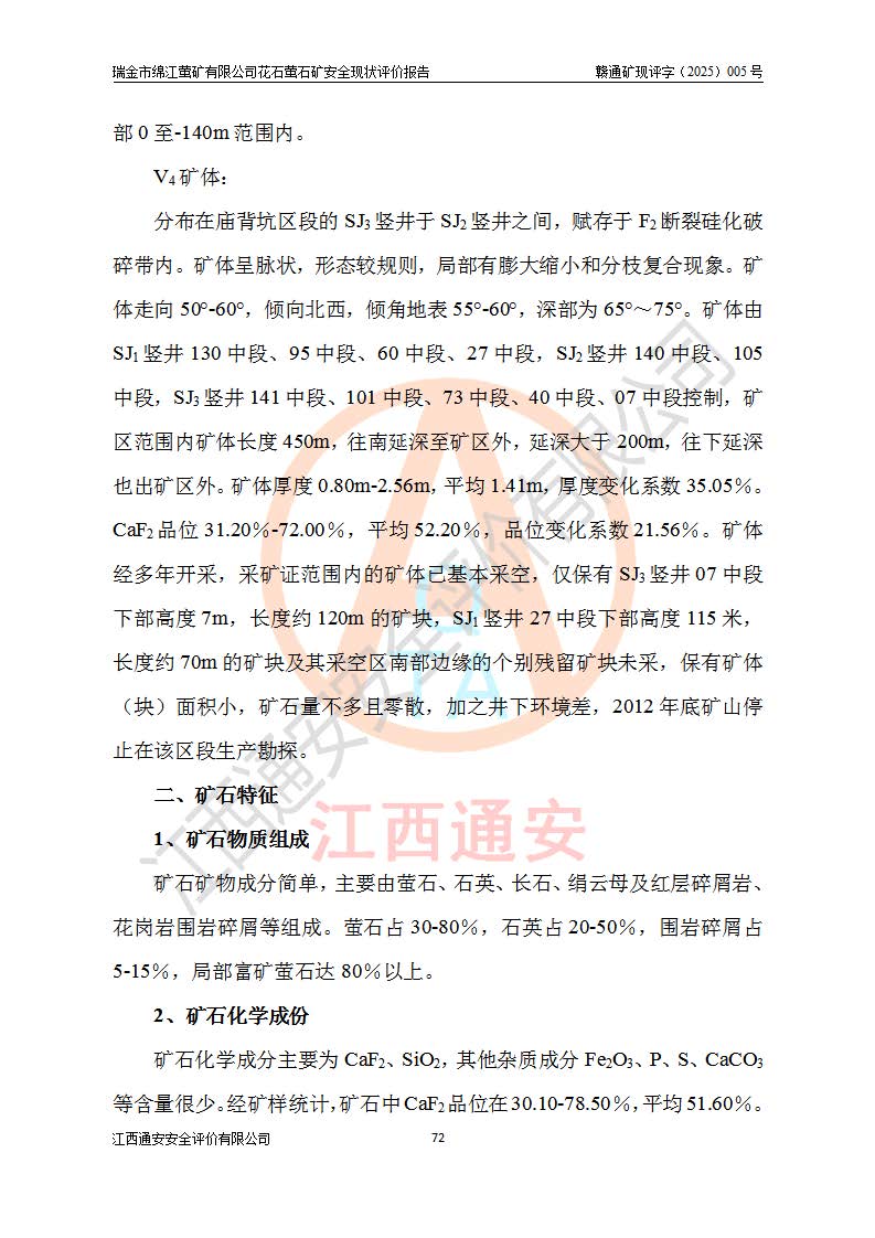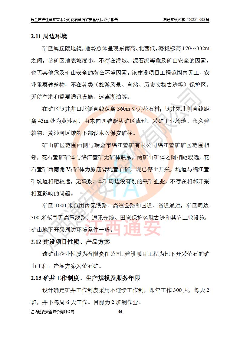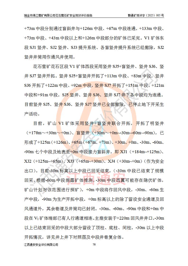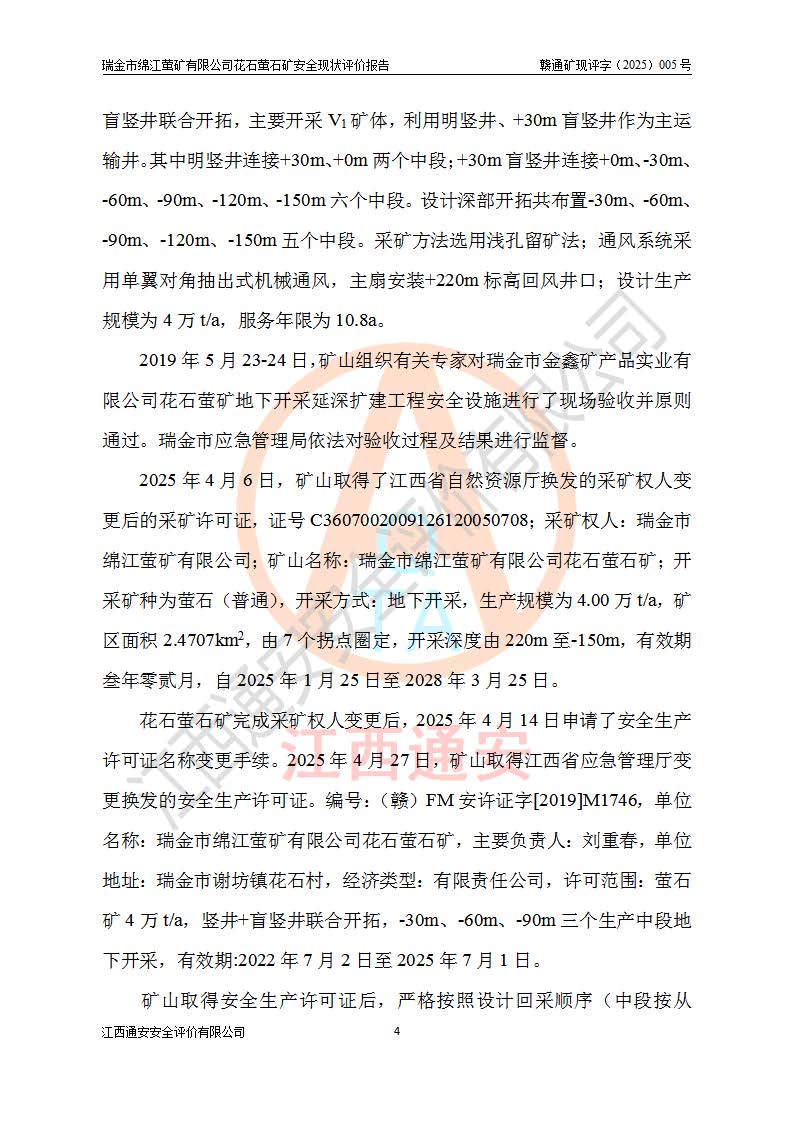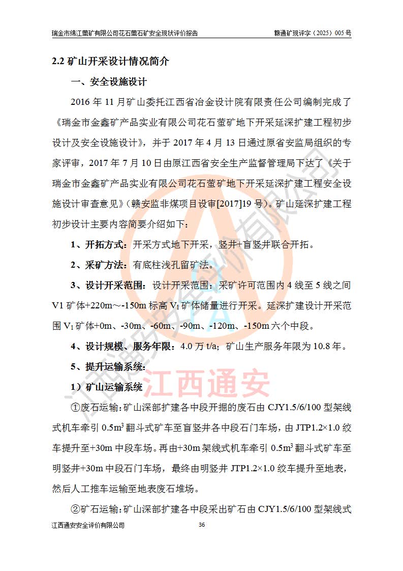 瑞金市綿江螢礦有限公司花石螢石礦區(qū)位于瑞金市南西215°方位直距30km處,礦區(qū)中心位置地理坐標(biāo)為東經(jīng)115°51′24″,北緯25°39′21″,行政區(qū)劃屬瑞金市謝坊鎮(zhèn)管轄。 礦山前身為瑞金市金鑫礦產(chǎn)品實(shí)業(yè)有限公司花石螢礦。為了進(jìn)一步穩(wěn)固螢石礦產(chǎn)業(yè)鏈,2024年9月瑞金市綿江螢礦有限公司申請(qǐng)將瑞金市金鑫礦產(chǎn)品實(shí)業(yè)有限公司花石螢礦采礦權(quán)**至其公司。2025年4月6日,花石螢石礦完成了采礦權(quán)人**手續(xù),并取得了新采礦許可證。 該螢石礦區(qū)開采始于上世紀(jì)九十年代,由當(dāng)?shù)孛癖娫诨ㄊV點(diǎn)和廟背坑礦點(diǎn)零星開采(廟背坑礦點(diǎn)位于花石礦點(diǎn)東側(cè),兩個(gè)礦點(diǎn)礦體直線距離約1km,廟背坑礦點(diǎn)已停止采礦活動(dòng)。本次評(píng)價(jià)對(duì)象為花石礦點(diǎn))。本世紀(jì)初,經(jīng)礦業(yè)秩序整頓、規(guī)范礦山開采,兩礦點(diǎn)分別由不同采礦權(quán)人依法辦理了采礦許可證,即廟背坑螢礦和花石螢石礦。2005年12月,根據(jù)贛州市人民**《贛市府辦發(fā)〔2005〕14號(hào)》文件有關(guān)礦業(yè)權(quán)整合的指示精神要求,兩個(gè)采礦權(quán)整合為一個(gè)采礦權(quán)人,即瑞金市金鑫礦產(chǎn)品實(shí)業(yè)有限公司,整合后采礦權(quán)面積2.4707km2,開采標(biāo)高+220m~0m。整合后,2011年8月,花石螢石礦委托江西省冶金設(shè)計(jì)院有限責(zé)任公司編制了《瑞金市金鑫礦產(chǎn)品實(shí)業(yè)有限公司花石螢礦地下開采整改初步設(shè)計(jì)安全專篇》。整改設(shè)計(jì)開采對(duì)象為花石區(qū)段V1礦體,采用豎井+盲豎井聯(lián)合開拓,主要井筒為SJ3豎井、MJ1盲豎井,SJ3豎井連接+125m中段,采用JTP-1.2×1.0型礦用提升絞車提升,MJ1盲豎井連接+65m中段、+83m中段,采用JTK-1.0×0.8型塊式制動(dòng)礦用提升絞車提升。設(shè)計(jì)開采深度+220m至+67m標(biāo)高,共布置+125m、+83m、+65m三個(gè)中段;設(shè)計(jì)生產(chǎn)規(guī)模為4萬噸/年,采礦方法選用淺孔留礦法。 根據(jù)整改設(shè)計(jì)要求,礦山經(jīng)過近一年多的整改施工,2012年9月通過由原贛州市安全生產(chǎn)監(jiān)督管理局組織的安全設(shè)施整改驗(yàn)收。2012年9月26日取得了由原江西省安全生產(chǎn)監(jiān)督管理局延期換發(fā)的《安全生產(chǎn)許可證》(編號(hào):FM安許證字[2005]M0033號(hào)),許可范圍:螢石礦4萬噸/年,豎井+盲豎井聯(lián)合開拓,+67m中段地下開采。 由于原整改設(shè)計(jì)范圍內(nèi)(+67m以上中段)V1礦體資源儲(chǔ)量無法使礦井達(dá)到持續(xù)穩(wěn)定的生產(chǎn)接替,根據(jù)2011年11月264核工業(yè)大隊(duì)《江西省瑞金市花石螢石礦資源儲(chǔ)量核實(shí)報(bào)告》及礦山提交的2013年度資源儲(chǔ)量動(dòng)態(tài)檢測(cè)報(bào)告。2013年4月,花石螢石礦又委托江西省冶金設(shè)計(jì)院有限責(zé)任公司為其編制了《瑞金市金鑫礦產(chǎn)品實(shí)業(yè)有限公司花石螢礦花石礦區(qū)地下開采改建工程初步設(shè)計(jì)安全專篇》。設(shè)計(jì)開采范圍+83m~+0m標(biāo)高;采用豎井開拓。設(shè)計(jì)新建開拓工程為新豎井及+83m、+40m、+0m三個(gè)中段。采礦方法為淺孔留礦法。 由于部分工程與設(shè)計(jì)不符。2014年10月,礦山委托江西省冶金設(shè)計(jì)院有限責(zé)任公司編制了《瑞金市金鑫礦產(chǎn)品實(shí)業(yè)有限公司花石螢礦花石礦區(qū)地下開采改建工程變更設(shè)計(jì)》,其中段布置變更為+30m、+0m中段;通風(fēng)系統(tǒng)變更為以新豎井為進(jìn)風(fēng)井;采用SJ3北東已有的平峒(PD)及平硐內(nèi)的人行、回風(fēng)斜巷MXJ1、MXJ2 、MXJ3并配置相關(guān)工程后作為礦區(qū)北東翼礦體開采的北東翼回風(fēng)系統(tǒng)。主扇安裝于+190m中段回風(fēng)道。 2015年9月,礦山改建工程安全設(shè)施通過了原江西省安全生產(chǎn)監(jiān)督管理局組織專家組竣工驗(yàn)收,并取得了原江西省安監(jiān)局延期換發(fā)的《安全生產(chǎn)許可證》(編號(hào):FM安許證字[2005]M0033號(hào)),許可范圍:螢石礦4萬噸/年,豎井開拓,+30m、0m中段地下開采。 花石螢礦V1礦體經(jīng)過多年開采后,原改建工程設(shè)計(jì)范圍內(nèi)(+0m以上中段)螢石礦資源儲(chǔ)量日漸減少。為了擴(kuò)大礦區(qū)資源儲(chǔ)量,延長(zhǎng)礦山服務(wù)年限,查明礦區(qū)深部螢石礦資源儲(chǔ)量。2014年礦山申請(qǐng)了采礦權(quán)變更開采深度的請(qǐng)示。2015年1月16日礦山取得了原贛州市礦產(chǎn)資源管理局頒發(fā)的劃定礦區(qū)范圍批復(fù)(贛市礦劃復(fù)[2015]0001號(hào)),劃定礦區(qū)范圍面積2.47km2,礦區(qū)范圍由7個(gè)拐點(diǎn)圈定,開采深度由+220m~-150m。同年,礦山委托江西省核工業(yè)地質(zhì)局二六四大隊(duì)編制完成了《江西省瑞金市花石螢石礦區(qū)資源儲(chǔ)量核實(shí)報(bào)告》并經(jīng)過了贛州市金輝礦業(yè)技術(shù)服務(wù)有限公司評(píng)審(贛金輝儲(chǔ)審字[2014]12號(hào)),原贛州市礦產(chǎn)資源管理局以“贛市礦儲(chǔ)備字[2014]18號(hào))”文對(duì)該報(bào)告?zhèn)浒浮?/span> 為了使礦井達(dá)到持續(xù)穩(wěn)定的生產(chǎn)接替,保持三級(jí)礦量平衡,2015年7月委托了江西省冶金設(shè)計(jì)院有
