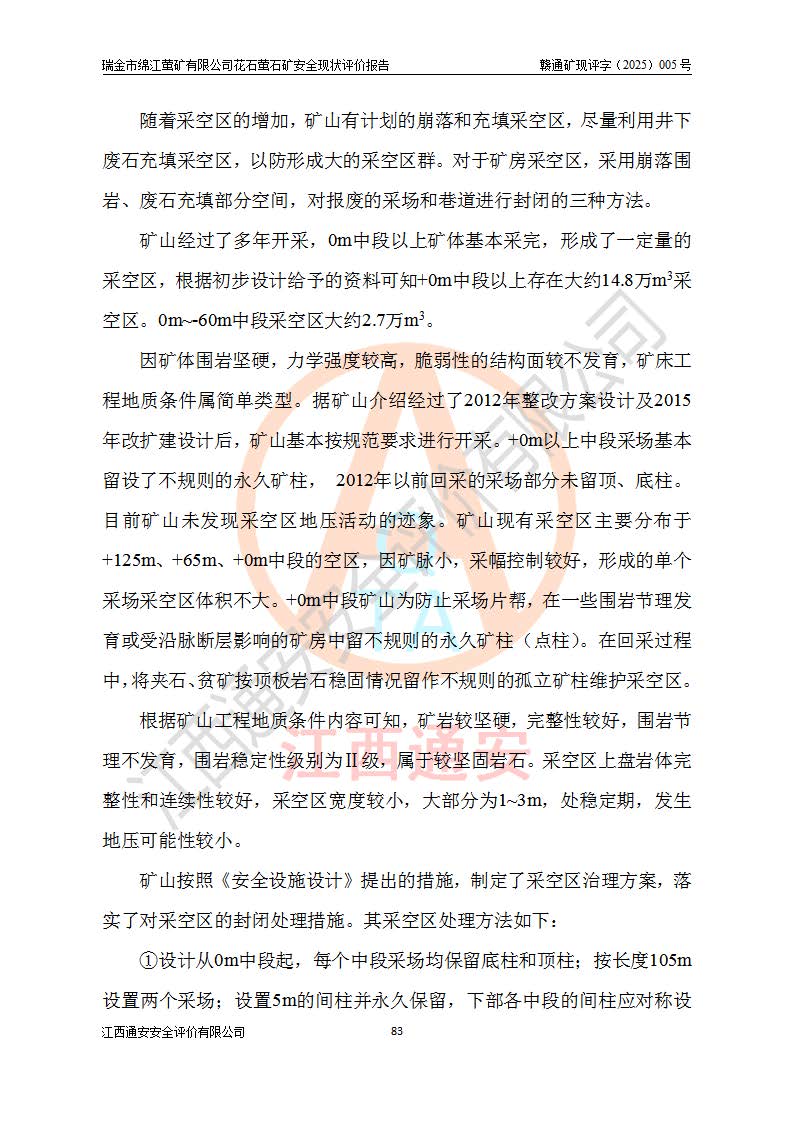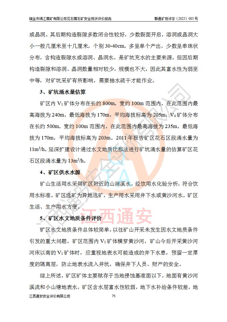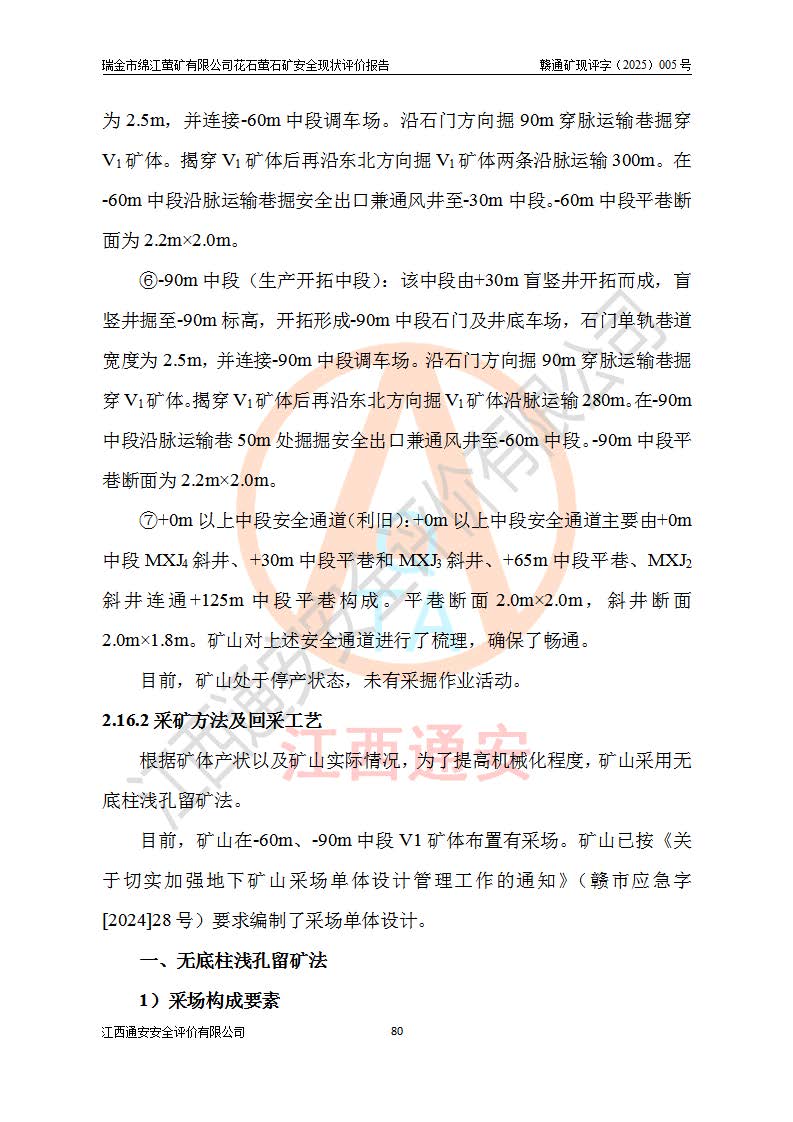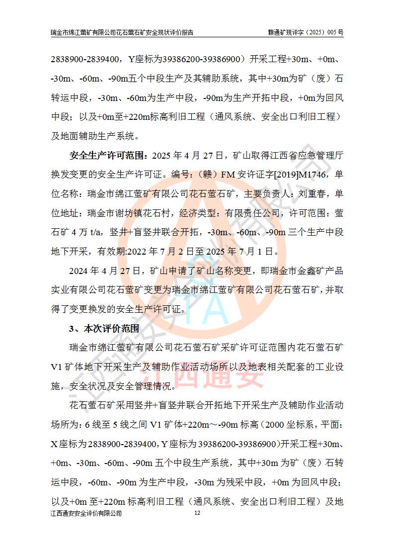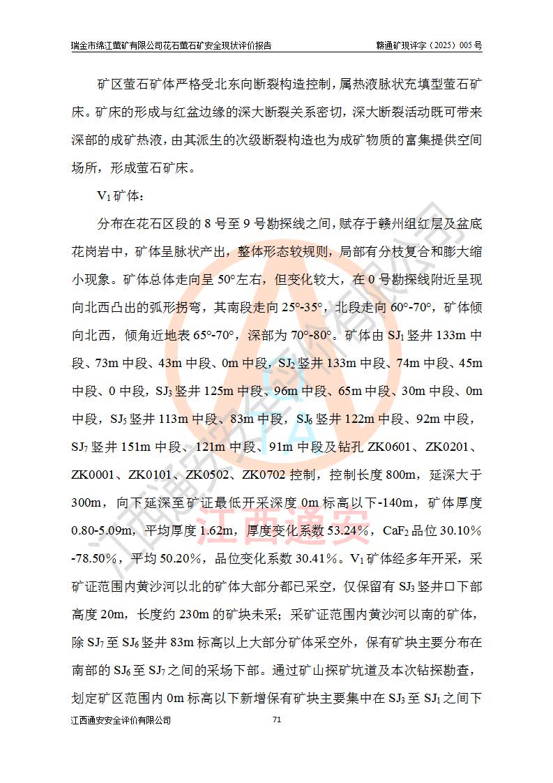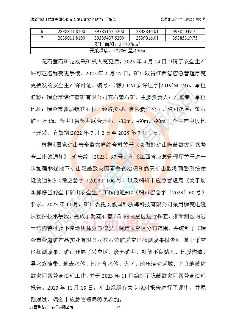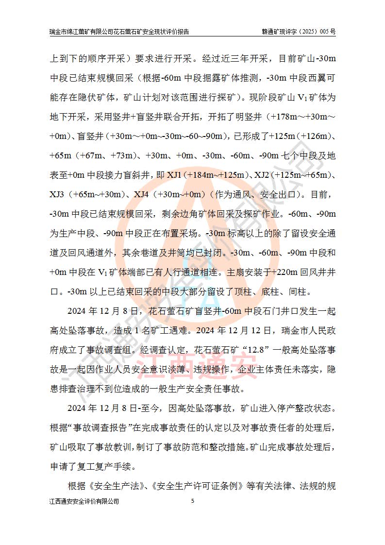 瑞金市綿江螢礦有限公司花石螢石礦區(qū)位于瑞金市南西215°方位直距30km處,礦區(qū)中心位置地理坐標(biāo)為東經(jīng)115°51′24″,北緯25°39′21″,行政區(qū)劃屬瑞金市謝坊鎮(zhèn)管轄。 礦山前身為瑞金市金鑫礦產(chǎn)品實(shí)業(yè)有限公司花石螢礦。為了進(jìn)一步穩(wěn)固螢石礦產(chǎn)業(yè)鏈,2024年9月瑞金市綿江螢礦有限公司申請(qǐng)將瑞金市金鑫礦產(chǎn)品實(shí)業(yè)有限公司花石螢礦采礦權(quán)**至其公司。2025年4月6日,花石螢石礦完成了采礦權(quán)人**手續(xù),并取得了新采礦許可證。 該螢石礦區(qū)開采始于上世紀(jì)九十年代,由當(dāng)?shù)孛癖娫诨ㄊV點(diǎn)和廟背坑礦點(diǎn)零星開采(廟背坑礦點(diǎn)位于花石礦點(diǎn)東側(cè),兩個(gè)礦點(diǎn)礦體直線距離約1km,廟背坑礦點(diǎn)已停止采礦活動(dòng)。本次評(píng)價(jià)對(duì)象為花石礦點(diǎn))。本世紀(jì)初,經(jīng)礦業(yè)秩序整頓、規(guī)范礦山開采,兩礦點(diǎn)分別由不同采礦權(quán)人依法辦理了采礦許可證,即廟背坑螢礦和花石螢石礦。2005年12月,根據(jù)贛州市人民**《贛市府辦發(fā)〔2005〕14號(hào)》文件有關(guān)礦業(yè)權(quán)整合的指示精神要求,兩個(gè)采礦權(quán)整合為一個(gè)采礦權(quán)人,即瑞金市金鑫礦產(chǎn)品實(shí)業(yè)有限公司,整合后采礦權(quán)面積2.4707km2,開采標(biāo)高+220m~0m。整合后,2011年8月,花石螢石礦委托江西省冶金設(shè)計(jì)院有限責(zé)任公司編制了《瑞金市金鑫礦產(chǎn)品實(shí)業(yè)有限公司花石螢礦地下開采整改初步設(shè)計(jì)安全專篇》。整改設(shè)計(jì)開采對(duì)象為花石區(qū)段V1礦體,采用豎井+盲豎井聯(lián)合開拓,主要井筒為SJ3豎井、MJ1盲豎井,SJ3豎井連接+125m中段,采用JTP-1.2×1.0型礦用提升絞車提升,MJ1盲豎井連接+65m中段、+83m中段,采用JTK-1.0×0.8型塊式制動(dòng)礦用提升絞車提升。設(shè)計(jì)開采深度+220m至+67m標(biāo)高,共布置+125m、+83m、+65m三個(gè)中段;設(shè)計(jì)生產(chǎn)規(guī)模為4萬噸/年,采礦方法選用淺孔留礦法。 根據(jù)整改設(shè)計(jì)要求,礦山經(jīng)過近一年多的整改施工,2012年9月通過由原贛州市安全生產(chǎn)監(jiān)督管理局組織的安全設(shè)施整改驗(yàn)收。2012年9月26日取得了由原江西省安全生產(chǎn)監(jiān)督管理局延期換發(fā)的《安全生產(chǎn)許可證》(編號(hào):FM安許證字[2005]M0033號(hào)),許可范圍:螢石礦4萬噸/年,豎井+盲豎井聯(lián)合開拓,+67m中段地下開采。 由于原整改設(shè)計(jì)范圍內(nèi)(+67m以上中段)V1礦體資源儲(chǔ)量無法使礦井達(dá)到持續(xù)穩(wěn)定的生產(chǎn)接替,根據(jù)2011年11月264核工業(yè)大隊(duì)《江西省瑞金市花石螢石礦資源儲(chǔ)量核實(shí)報(bào)告》及礦山提交的2013年度資源儲(chǔ)量動(dòng)態(tài)檢測(cè)報(bào)告。2013年4月,花石螢石礦又委托江西省冶金設(shè)計(jì)院有限責(zé)任公司為其編制了《瑞金市金鑫礦產(chǎn)品實(shí)業(yè)有限公司花石螢礦花石礦區(qū)地下開采改建工程初步設(shè)計(jì)安全專篇》。設(shè)計(jì)開采范圍+83m~+0m標(biāo)高;采用豎井開拓。設(shè)計(jì)新建開拓工程為新豎井及+83m、+40m、+0m三個(gè)中段。采礦方法為淺孔留礦法。 由于部分工程與設(shè)計(jì)不符。2014年10月,礦山委托江西省冶金設(shè)計(jì)院有限責(zé)任公司編制了《瑞金市金鑫礦產(chǎn)品實(shí)業(yè)有限公司花石螢礦花石礦區(qū)地下開采改建工程變更設(shè)計(jì)》,其中段布置變更為+30m、+0m中段;通風(fēng)系統(tǒng)變更為以新豎井為進(jìn)風(fēng)井;采用SJ3北東已有的平峒(PD)及平硐內(nèi)的人行、回風(fēng)斜巷MXJ1、MXJ2 、MXJ3并配置相關(guān)工程后作為礦區(qū)北東翼礦體開采的北東翼回風(fēng)系統(tǒng)。主扇安裝于+190m中段回風(fēng)道。 2015年9月,礦山改建工程安全設(shè)施通過了原江西省安全生產(chǎn)監(jiān)督管理局組織專家組竣工驗(yàn)收,并取得了原江西省安監(jiān)局延期換發(fā)的《安全生產(chǎn)許可證》(編號(hào):FM安許證字[2005]M0033號(hào)),許可范圍:螢石礦4萬噸/年,豎井開拓,+30m、0m中段地下開采。 花石螢礦V1礦體經(jīng)過多年開采后,原改建工程設(shè)計(jì)范圍內(nèi)(+0m以上中段)螢石礦資源儲(chǔ)量日漸減少。為了擴(kuò)大礦區(qū)資源儲(chǔ)量,延長(zhǎng)礦山服務(wù)年限,查明礦區(qū)深部螢石礦資源儲(chǔ)量。2014年礦山申請(qǐng)了采礦權(quán)變更開采深度的請(qǐng)示。2015年1月16日礦山取得了原贛州市礦產(chǎn)資源管理局頒發(fā)的劃定礦區(qū)范圍批復(fù)(贛市礦劃復(fù)[2015]0001號(hào)),劃定礦區(qū)范圍面積2.47km2,礦區(qū)范圍由7個(gè)拐點(diǎn)圈定,開采深度由+220m~-150m。同年,礦山委托江西省核工業(yè)地質(zhì)局二六四大隊(duì)編制完成了《江西省瑞金市花石螢石礦區(qū)資源儲(chǔ)量核實(shí)報(bào)告》并經(jīng)過了贛州市金輝礦業(yè)技術(shù)服務(wù)有限公司評(píng)審(贛金輝儲(chǔ)審字[2014]12號(hào)),原贛州市礦產(chǎn)資源管理局以“贛市礦儲(chǔ)備字[2014]18號(hào))”文對(duì)該報(bào)告?zhèn)浒浮?/span> 為了使礦井達(dá)到持續(xù)穩(wěn)定的生產(chǎn)接替,保持三級(jí)礦量平衡,2015年7月委托了江西省冶金設(shè)計(jì)院有