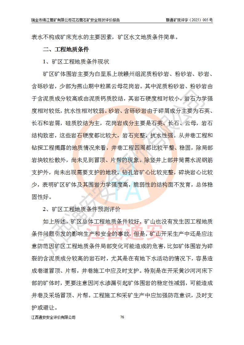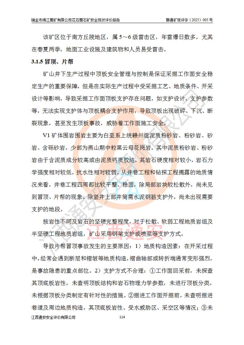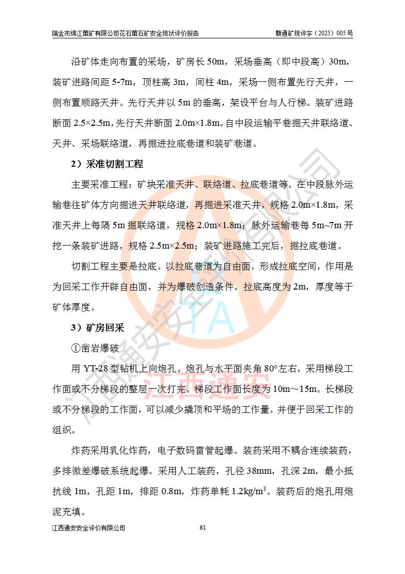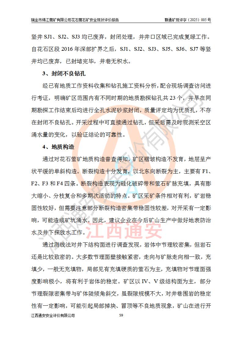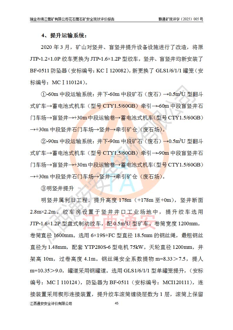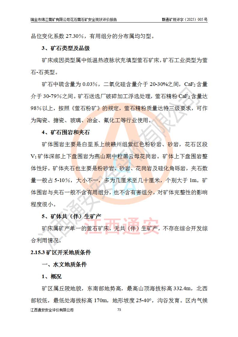 瑞金市綿江螢礦有限公司花石螢石礦區(qū)位于瑞金市南西215°方位直距30km處,礦區(qū)中心位置地理坐標(biāo)為東經(jīng)115°51′24″,北緯25°39′21″,行政區(qū)劃屬瑞金市謝坊鎮(zhèn)管轄。 礦山前身為瑞金市金鑫礦產(chǎn)品實(shí)業(yè)有限公司花石螢礦。為了進(jìn)一步穩(wěn)固螢石礦產(chǎn)業(yè)鏈,2024年9月瑞金市綿江螢礦有限公司申請(qǐng)將瑞金市金鑫礦產(chǎn)品實(shí)業(yè)有限公司花石螢礦采礦權(quán)**至其公司。2025年4月6日,花石螢石礦完成了采礦權(quán)人**手續(xù),并取得了新采礦許可證。 該螢石礦區(qū)開采始于上世紀(jì)九十年代,由當(dāng)?shù)孛癖娫诨ㄊV點(diǎn)和廟背坑礦點(diǎn)零星開采(廟背坑礦點(diǎn)位于花石礦點(diǎn)東側(cè),兩個(gè)礦點(diǎn)礦體直線距離約1km,廟背坑礦點(diǎn)已停止采礦活動(dòng)。本次評(píng)價(jià)對(duì)象為花石礦點(diǎn))。本世紀(jì)初,經(jīng)礦業(yè)秩序整頓、規(guī)范礦山開采,兩礦點(diǎn)分別由不同采礦權(quán)人依法辦理了采礦許可證,即廟背坑螢礦和花石螢石礦。2005年12月,根據(jù)贛州市人民**《贛市府辦發(fā)〔2005〕14號(hào)》文件有關(guān)礦業(yè)權(quán)整合的指示精神要求,兩個(gè)采礦權(quán)整合為一個(gè)采礦權(quán)人,即瑞金市金鑫礦產(chǎn)品實(shí)業(yè)有限公司,整合后采礦權(quán)面積2.4707km2,開采標(biāo)高+220m~0m。整合后,2011年8月,花石螢石礦委托江西省冶金設(shè)計(jì)院有限責(zé)任公司編制了《瑞金市金鑫礦產(chǎn)品實(shí)業(yè)有限公司花石螢礦地下開采整改初步設(shè)計(jì)安全專篇》。整改設(shè)計(jì)開采對(duì)象為花石區(qū)段V1礦體,采用豎井+盲豎井聯(lián)合開拓,主要井筒為SJ3豎井、MJ1盲豎井,SJ3豎井連接+125m中段,采用JTP-1.2×1.0型礦用提升絞車提升,MJ1盲豎井連接+65m中段、+83m中段,采用JTK-1.0×0.8型塊式制動(dòng)礦用提升絞車提升。設(shè)計(jì)開采深度+220m至+67m標(biāo)高,共布置+125m、+83m、+65m三個(gè)中段;設(shè)計(jì)生產(chǎn)規(guī)模為4萬噸/年,采礦方法選用淺孔留礦法。 根據(jù)整改設(shè)計(jì)要求,礦山經(jīng)過近一年多的整改施工,2012年9月通過由原贛州市安全生產(chǎn)監(jiān)督管理局組織的安全設(shè)施整改驗(yàn)收。2012年9月26日取得了由原江西省安全生產(chǎn)監(jiān)督管理局延期換發(fā)的《安全生產(chǎn)許可證》(編號(hào):FM安許證字[2005]M0033號(hào)),許可范圍:螢石礦4萬噸/年,豎井+盲豎井聯(lián)合開拓,+67m中段地下開采。 由于原整改設(shè)計(jì)范圍內(nèi)(+67m以上中段)V1礦體資源儲(chǔ)量無法使礦井達(dá)到持續(xù)穩(wěn)定的生產(chǎn)接替,根據(jù)2011年11月264核工業(yè)大隊(duì)《江西省瑞金市花石螢石礦資源儲(chǔ)量核實(shí)報(bào)告》及礦山提交的2013年度資源儲(chǔ)量動(dòng)態(tài)檢測(cè)報(bào)告。2013年4月,花石螢石礦又委托江西省冶金設(shè)計(jì)院有限責(zé)任公司為其編制了《瑞金市金鑫礦產(chǎn)品實(shí)業(yè)有限公司花石螢礦花石礦區(qū)地下開采改建工程初步設(shè)計(jì)安全專篇》。設(shè)計(jì)開采范圍+83m~+0m標(biāo)高;采用豎井開拓。設(shè)計(jì)新建開拓工程為新豎井及+83m、+40m、+0m三個(gè)中段。采礦方法為淺孔留礦法。 由于部分工程與設(shè)計(jì)不符。2014年10月,礦山委托江西省冶金設(shè)計(jì)院有限責(zé)任公司編制了《瑞金市金鑫礦產(chǎn)品實(shí)業(yè)有限公司花石螢礦花石礦區(qū)地下開采改建工程變更設(shè)計(jì)》,其中段布置變更為+30m、+0m中段;通風(fēng)系統(tǒng)變更為以新豎井為進(jìn)風(fēng)井;采用SJ3北東已有的平峒(PD)及平硐內(nèi)的人行、回風(fēng)斜巷MXJ1、MXJ2 、MXJ3并配置相關(guān)工程后作為礦區(qū)北東翼礦體開采的北東翼回風(fēng)系統(tǒng)。主扇安裝于+190m中段回風(fēng)道。 2015年9月,礦山改建工程安全設(shè)施通過了原江西省安全生產(chǎn)監(jiān)督管理局組織專家組竣工驗(yàn)收,并取得了原江西省安監(jiān)局延期換發(fā)的《安全生產(chǎn)許可證》(編號(hào):FM安許證字[2005]M0033號(hào)),許可范圍:螢石礦4萬噸/年,豎井開拓,+30m、0m中段地下開采。 花石螢礦V1礦體經(jīng)過多年開采后,原改建工程設(shè)計(jì)范圍內(nèi)(+0m以上中段)螢石礦資源儲(chǔ)量日漸減少。為了擴(kuò)大礦區(qū)資源儲(chǔ)量,延長(zhǎng)礦山服務(wù)年限,查明礦區(qū)深部螢石礦資源儲(chǔ)量。2014年礦山申請(qǐng)了采礦權(quán)變更開采深度的請(qǐng)示。2015年1月16日礦山取得了原贛州市礦產(chǎn)資源管理局頒發(fā)的劃定礦區(qū)范圍批復(fù)(贛市礦劃復(fù)[2015]0001號(hào)),劃定礦區(qū)范圍面積2.47km2,礦區(qū)范圍由7個(gè)拐點(diǎn)圈定,開采深度由+220m~-150m。同年,礦山委托江西省核工業(yè)地質(zhì)局二六四大隊(duì)編制完成了《江西省瑞金市花石螢石礦區(qū)資源儲(chǔ)量核實(shí)報(bào)告》并經(jīng)過了贛州市金輝礦業(yè)技術(shù)服務(wù)有限公司評(píng)審(贛金輝儲(chǔ)審字[2014]12號(hào)),原贛州市礦產(chǎn)資源管理局以“贛市礦儲(chǔ)備字[2014]18號(hào))”文對(duì)該報(bào)告?zhèn)浒浮?/span> 為了使礦井達(dá)到持續(xù)穩(wěn)定的生產(chǎn)接替,保持三級(jí)礦量平衡,2015年7月委托了江西省冶金設(shè)計(jì)院有