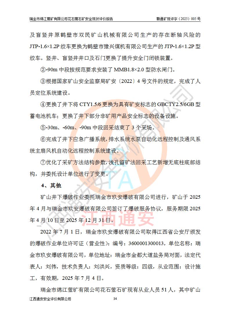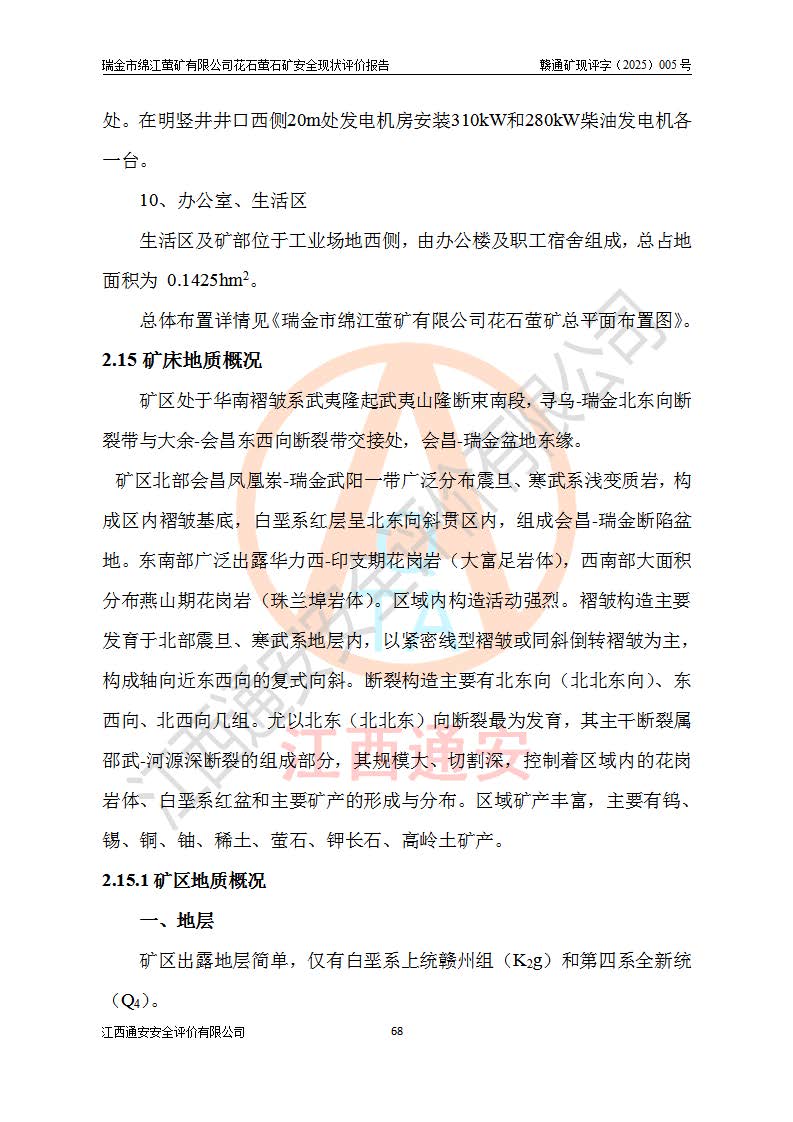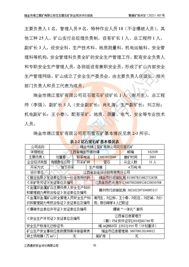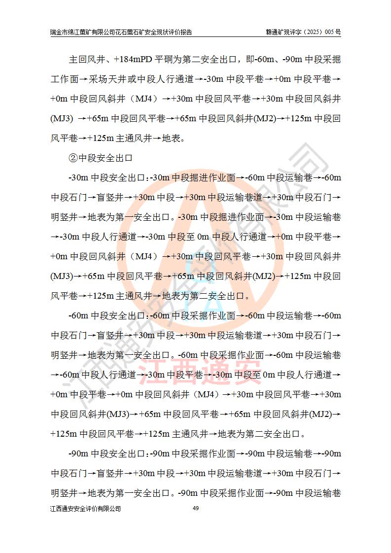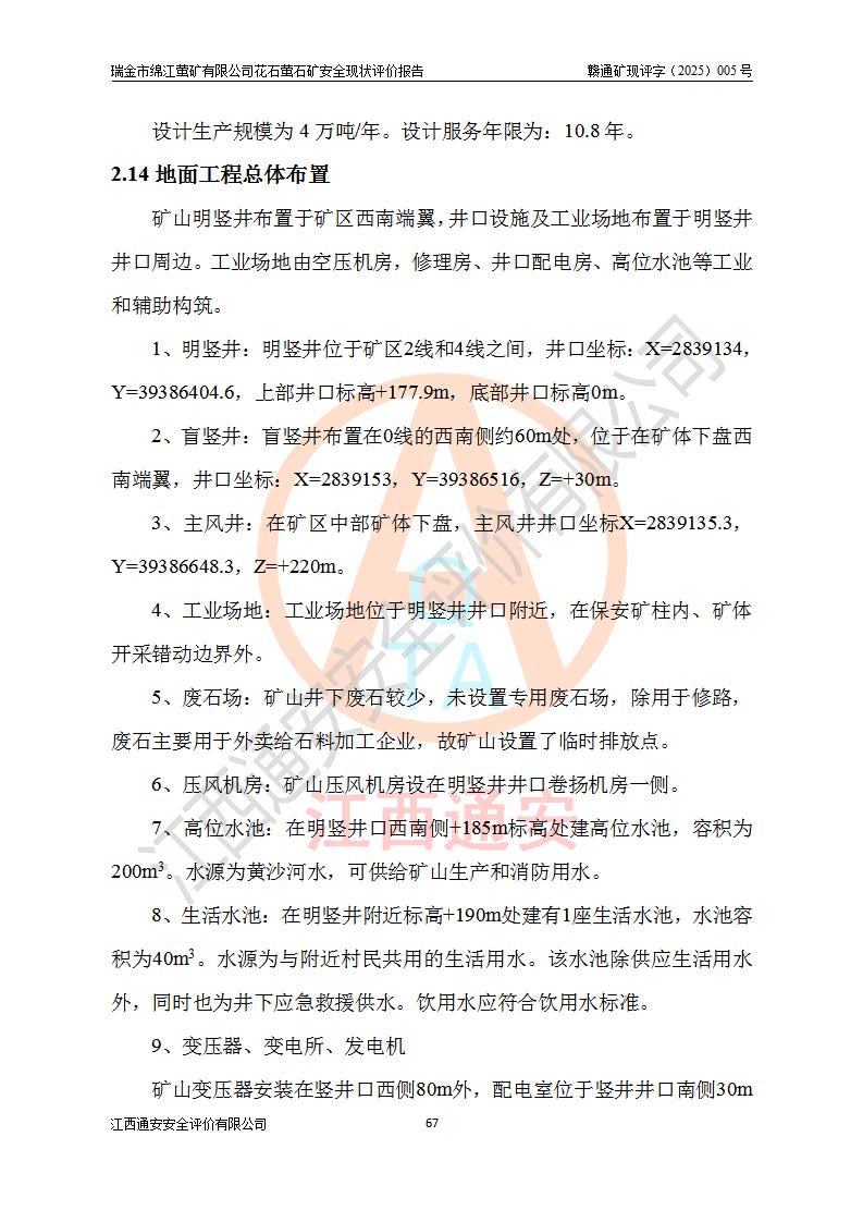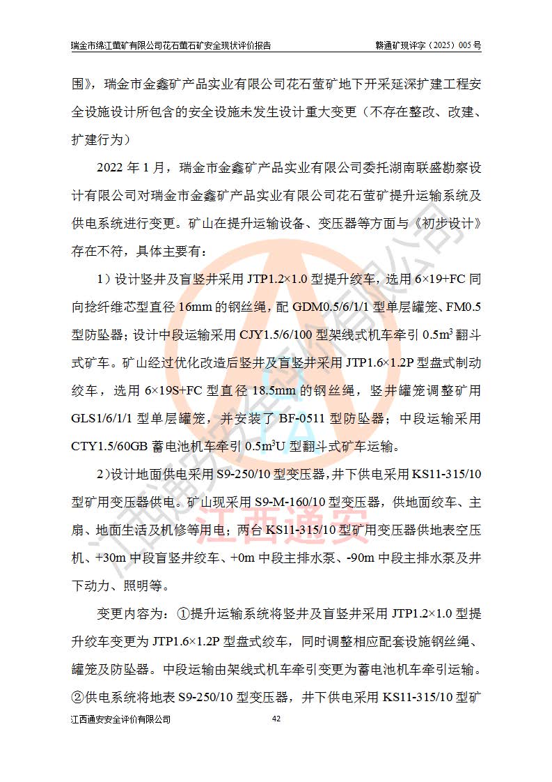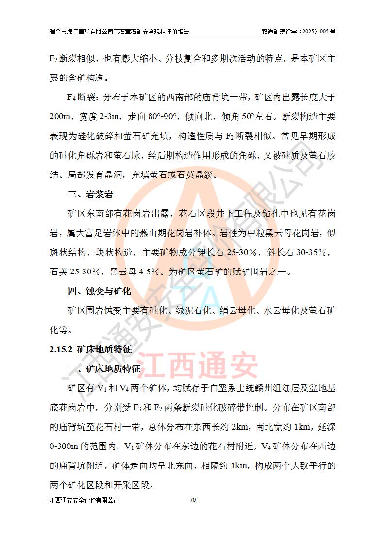 瑞金市綿江螢礦有限公司花石螢石礦區(qū)位于瑞金市南西215°方位直距30km處,礦區(qū)中心位置地理坐標(biāo)為東經(jīng)115°51′24″,北緯25°39′21″,行政區(qū)劃屬瑞金市謝坊鎮(zhèn)管轄。 礦山前身為瑞金市金鑫礦產(chǎn)品實(shí)業(yè)有限公司花石螢礦。為了進(jìn)一步穩(wěn)固螢石礦產(chǎn)業(yè)鏈,2024年9月瑞金市綿江螢礦有限公司申請(qǐng)將瑞金市金鑫礦產(chǎn)品實(shí)業(yè)有限公司花石螢礦采礦權(quán)**至其公司。2025年4月6日,花石螢石礦完成了采礦權(quán)人**手續(xù),并取得了新采礦許可證。 該螢石礦區(qū)開采始于上世紀(jì)九十年代,由當(dāng)?shù)孛癖娫诨ㄊV點(diǎn)和廟背坑礦點(diǎn)零星開采(廟背坑礦點(diǎn)位于花石礦點(diǎn)東側(cè),兩個(gè)礦點(diǎn)礦體直線距離約1km,廟背坑礦點(diǎn)已停止采礦活動(dòng)。本次評(píng)價(jià)對(duì)象為花石礦點(diǎn))。本世紀(jì)初,經(jīng)礦業(yè)秩序整頓、規(guī)范礦山開采,兩礦點(diǎn)分別由不同采礦權(quán)人依法辦理了采礦許可證,即廟背坑螢礦和花石螢石礦。2005年12月,根據(jù)贛州市人民**《贛市府辦發(fā)〔2005〕14號(hào)》文件有關(guān)礦業(yè)權(quán)整合的指示精神要求,兩個(gè)采礦權(quán)整合為一個(gè)采礦權(quán)人,即瑞金市金鑫礦產(chǎn)品實(shí)業(yè)有限公司,整合后采礦權(quán)面積2.4707km2,開采標(biāo)高+220m~0m。整合后,2011年8月,花石螢石礦委托江西省冶金設(shè)計(jì)院有限責(zé)任公司編制了《瑞金市金鑫礦產(chǎn)品實(shí)業(yè)有限公司花石螢礦地下開采整改初步設(shè)計(jì)安全專篇》。整改設(shè)計(jì)開采對(duì)象為花石區(qū)段V1礦體,采用豎井+盲豎井聯(lián)合開拓,主要井筒為SJ3豎井、MJ1盲豎井,SJ3豎井連接+125m中段,采用JTP-1.2×1.0型礦用提升絞車提升,MJ1盲豎井連接+65m中段、+83m中段,采用JTK-1.0×0.8型塊式制動(dòng)礦用提升絞車提升。設(shè)計(jì)開采深度+220m至+67m標(biāo)高,共布置+125m、+83m、+65m三個(gè)中段;設(shè)計(jì)生產(chǎn)規(guī)模為4萬噸/年,采礦方法選用淺孔留礦法。 根據(jù)整改設(shè)計(jì)要求,礦山經(jīng)過近一年多的整改施工,2012年9月通過由原贛州市安全生產(chǎn)監(jiān)督管理局組織的安全設(shè)施整改驗(yàn)收。2012年9月26日取得了由原江西省安全生產(chǎn)監(jiān)督管理局延期換發(fā)的《安全生產(chǎn)許可證》(編號(hào):FM安許證字[2005]M0033號(hào)),許可范圍:螢石礦4萬噸/年,豎井+盲豎井聯(lián)合開拓,+67m中段地下開采。 由于原整改設(shè)計(jì)范圍內(nèi)(+67m以上中段)V1礦體資源儲(chǔ)量無法使礦井達(dá)到持續(xù)穩(wěn)定的生產(chǎn)接替,根據(jù)2011年11月264核工業(yè)大隊(duì)《江西省瑞金市花石螢石礦資源儲(chǔ)量核實(shí)報(bào)告》及礦山提交的2013年度資源儲(chǔ)量動(dòng)態(tài)檢測(cè)報(bào)告。2013年4月,花石螢石礦又委托江西省冶金設(shè)計(jì)院有限責(zé)任公司為其編制了《瑞金市金鑫礦產(chǎn)品實(shí)業(yè)有限公司花石螢礦花石礦區(qū)地下開采改建工程初步設(shè)計(jì)安全專篇》。設(shè)計(jì)開采范圍+83m~+0m標(biāo)高;采用豎井開拓。設(shè)計(jì)新建開拓工程為新豎井及+83m、+40m、+0m三個(gè)中段。采礦方法為淺孔留礦法。 由于部分工程與設(shè)計(jì)不符。2014年10月,礦山委托江西省冶金設(shè)計(jì)院有限責(zé)任公司編制了《瑞金市金鑫礦產(chǎn)品實(shí)業(yè)有限公司花石螢礦花石礦區(qū)地下開采改建工程變更設(shè)計(jì)》,其中段布置變更為+30m、+0m中段;通風(fēng)系統(tǒng)變更為以新豎井為進(jìn)風(fēng)井;采用SJ3北東已有的平峒(PD)及平硐內(nèi)的人行、回風(fēng)斜巷MXJ1、MXJ2 、MXJ3并配置相關(guān)工程后作為礦區(qū)北東翼礦體開采的北東翼回風(fēng)系統(tǒng)。主扇安裝于+190m中段回風(fēng)道。 2015年9月,礦山改建工程安全設(shè)施通過了原江西省安全生產(chǎn)監(jiān)督管理局組織專家組竣工驗(yàn)收,并取得了原江西省安監(jiān)局延期換發(fā)的《安全生產(chǎn)許可證》(編號(hào):FM安許證字[2005]M0033號(hào)),許可范圍:螢石礦4萬噸/年,豎井開拓,+30m、0m中段地下開采。 花石螢礦V1礦體經(jīng)過多年開采后,原改建工程設(shè)計(jì)范圍內(nèi)(+0m以上中段)螢石礦資源儲(chǔ)量日漸減少。為了擴(kuò)大礦區(qū)資源儲(chǔ)量,延長(zhǎng)礦山服務(wù)年限,查明礦區(qū)深部螢石礦資源儲(chǔ)量。2014年礦山申請(qǐng)了采礦權(quán)變更開采深度的請(qǐng)示。2015年1月16日礦山取得了原贛州市礦產(chǎn)資源管理局頒發(fā)的劃定礦區(qū)范圍批復(fù)(贛市礦劃復(fù)[2015]0001號(hào)),劃定礦區(qū)范圍面積2.47km2,礦區(qū)范圍由7個(gè)拐點(diǎn)圈定,開采深度由+220m~-150m。同年,礦山委托江西省核工業(yè)地質(zhì)局二六四大隊(duì)編制完成了《江西省瑞金市花石螢石礦區(qū)資源儲(chǔ)量核實(shí)報(bào)告》并經(jīng)過了贛州市金輝礦業(yè)技術(shù)服務(wù)有限公司評(píng)審(贛金輝儲(chǔ)審字[2014]12號(hào)),原贛州市礦產(chǎn)資源管理局以“贛市礦儲(chǔ)備字[2014]18號(hào))”文對(duì)該報(bào)告?zhèn)浒浮?/span> 為了使礦井達(dá)到持續(xù)穩(wěn)定的生產(chǎn)接替,保持三級(jí)礦量平衡,2015年7月委托了江西省冶金設(shè)計(jì)院有