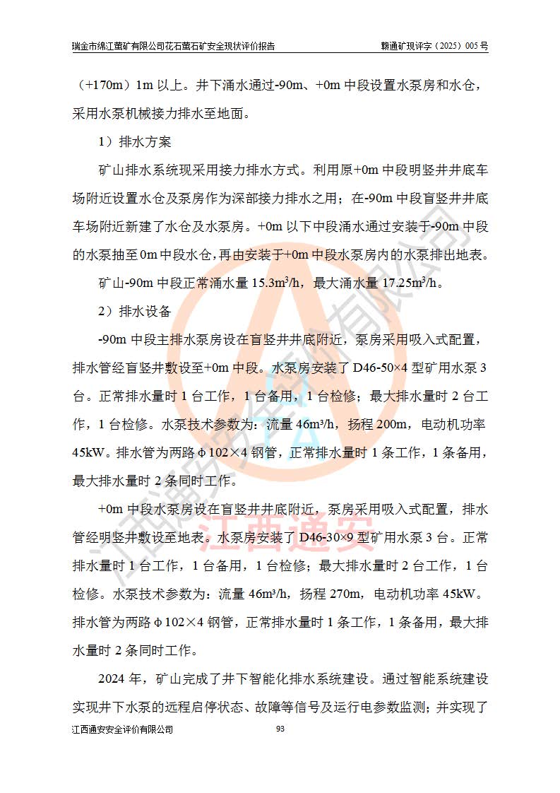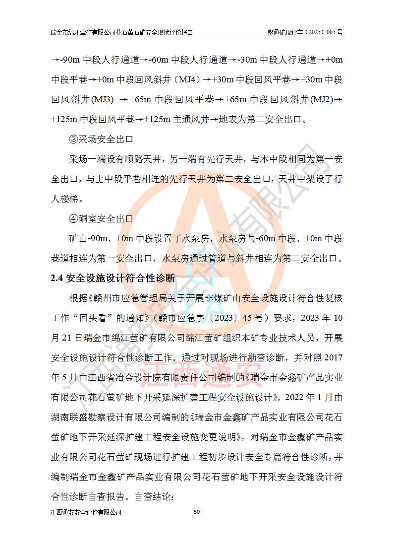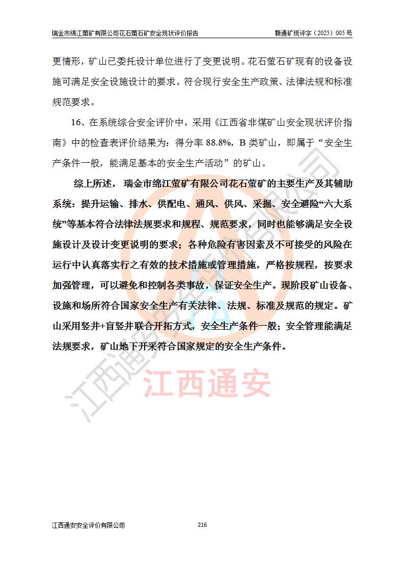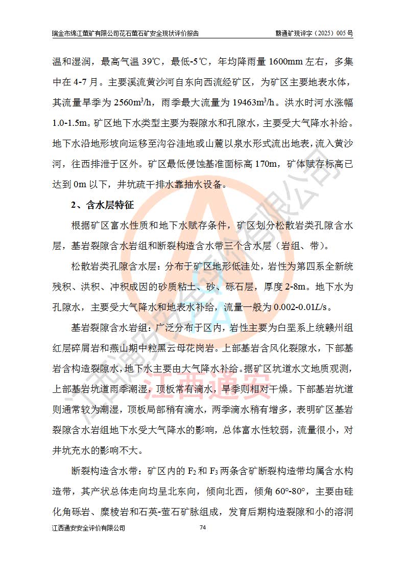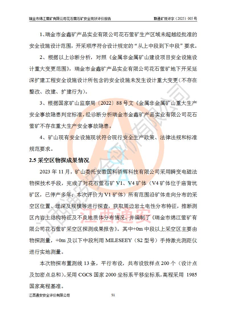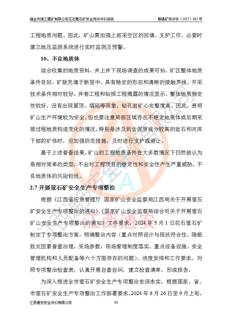 瑞金市綿江螢礦有限公司花石螢石礦區(qū)位于瑞金市南西215°方位直距30km處,礦區(qū)中心位置地理坐標(biāo)為東經(jīng)115°51′24″,北緯25°39′21″,行政區(qū)劃屬瑞金市謝坊鎮(zhèn)管轄。 礦山前身為瑞金市金鑫礦產(chǎn)品實(shí)業(yè)有限公司花石螢礦。為了進(jìn)一步穩(wěn)固螢石礦產(chǎn)業(yè)鏈,2024年9月瑞金市綿江螢礦有限公司申請(qǐng)將瑞金市金鑫礦產(chǎn)品實(shí)業(yè)有限公司花石螢礦采礦權(quán)**至其公司。2025年4月6日,花石螢石礦完成了采礦權(quán)人**手續(xù),并取得了新采礦許可證。 該螢石礦區(qū)開采始于上世紀(jì)九十年代,由當(dāng)?shù)孛癖娫诨ㄊV點(diǎn)和廟背坑礦點(diǎn)零星開采(廟背坑礦點(diǎn)位于花石礦點(diǎn)東側(cè),兩個(gè)礦點(diǎn)礦體直線距離約1km,廟背坑礦點(diǎn)已停止采礦活動(dòng)。本次評(píng)價(jià)對(duì)象為花石礦點(diǎn))。本世紀(jì)初,經(jīng)礦業(yè)秩序整頓、規(guī)范礦山開采,兩礦點(diǎn)分別由不同采礦權(quán)人依法辦理了采礦許可證,即廟背坑螢礦和花石螢石礦。2005年12月,根據(jù)贛州市人民**《贛市府辦發(fā)〔2005〕14號(hào)》文件有關(guān)礦業(yè)權(quán)整合的指示精神要求,兩個(gè)采礦權(quán)整合為一個(gè)采礦權(quán)人,即瑞金市金鑫礦產(chǎn)品實(shí)業(yè)有限公司,整合后采礦權(quán)面積2.4707km2,開采標(biāo)高+220m~0m。整合后,2011年8月,花石螢石礦委托江西省冶金設(shè)計(jì)院有限責(zé)任公司編制了《瑞金市金鑫礦產(chǎn)品實(shí)業(yè)有限公司花石螢礦地下開采整改初步設(shè)計(jì)安全專篇》。整改設(shè)計(jì)開采對(duì)象為花石區(qū)段V1礦體,采用豎井+盲豎井聯(lián)合開拓,主要井筒為SJ3豎井、MJ1盲豎井,SJ3豎井連接+125m中段,采用JTP-1.2×1.0型礦用提升絞車提升,MJ1盲豎井連接+65m中段、+83m中段,采用JTK-1.0×0.8型塊式制動(dòng)礦用提升絞車提升。設(shè)計(jì)開采深度+220m至+67m標(biāo)高,共布置+125m、+83m、+65m三個(gè)中段;設(shè)計(jì)生產(chǎn)規(guī)模為4萬噸/年,采礦方法選用淺孔留礦法。 根據(jù)整改設(shè)計(jì)要求,礦山經(jīng)過近一年多的整改施工,2012年9月通過由原贛州市安全生產(chǎn)監(jiān)督管理局組織的安全設(shè)施整改驗(yàn)收。2012年9月26日取得了由原江西省安全生產(chǎn)監(jiān)督管理局延期換發(fā)的《安全生產(chǎn)許可證》(編號(hào):FM安許證字[2005]M0033號(hào)),許可范圍:螢石礦4萬噸/年,豎井+盲豎井聯(lián)合開拓,+67m中段地下開采。 由于原整改設(shè)計(jì)范圍內(nèi)(+67m以上中段)V1礦體資源儲(chǔ)量無法使礦井達(dá)到持續(xù)穩(wěn)定的生產(chǎn)接替,根據(jù)2011年11月264核工業(yè)大隊(duì)《江西省瑞金市花石螢石礦資源儲(chǔ)量核實(shí)報(bào)告》及礦山提交的2013年度資源儲(chǔ)量動(dòng)態(tài)檢測(cè)報(bào)告。2013年4月,花石螢石礦又委托江西省冶金設(shè)計(jì)院有限責(zé)任公司為其編制了《瑞金市金鑫礦產(chǎn)品實(shí)業(yè)有限公司花石螢礦花石礦區(qū)地下開采改建工程初步設(shè)計(jì)安全專篇》。設(shè)計(jì)開采范圍+83m~+0m標(biāo)高;采用豎井開拓。設(shè)計(jì)新建開拓工程為新豎井及+83m、+40m、+0m三個(gè)中段。采礦方法為淺孔留礦法。 由于部分工程與設(shè)計(jì)不符。2014年10月,礦山委托江西省冶金設(shè)計(jì)院有限責(zé)任公司編制了《瑞金市金鑫礦產(chǎn)品實(shí)業(yè)有限公司花石螢礦花石礦區(qū)地下開采改建工程變更設(shè)計(jì)》,其中段布置變更為+30m、+0m中段;通風(fēng)系統(tǒng)變更為以新豎井為進(jìn)風(fēng)井;采用SJ3北東已有的平峒(PD)及平硐內(nèi)的人行、回風(fēng)斜巷MXJ1、MXJ2 、MXJ3并配置相關(guān)工程后作為礦區(qū)北東翼礦體開采的北東翼回風(fēng)系統(tǒng)。主扇安裝于+190m中段回風(fēng)道。 2015年9月,礦山改建工程安全設(shè)施通過了原江西省安全生產(chǎn)監(jiān)督管理局組織專家組竣工驗(yàn)收,并取得了原江西省安監(jiān)局延期換發(fā)的《安全生產(chǎn)許可證》(編號(hào):FM安許證字[2005]M0033號(hào)),許可范圍:螢石礦4萬噸/年,豎井開拓,+30m、0m中段地下開采。 花石螢礦V1礦體經(jīng)過多年開采后,原改建工程設(shè)計(jì)范圍內(nèi)(+0m以上中段)螢石礦資源儲(chǔ)量日漸減少。為了擴(kuò)大礦區(qū)資源儲(chǔ)量,延長(zhǎng)礦山服務(wù)年限,查明礦區(qū)深部螢石礦資源儲(chǔ)量。2014年礦山申請(qǐng)了采礦權(quán)變更開采深度的請(qǐng)示。2015年1月16日礦山取得了原贛州市礦產(chǎn)資源管理局頒發(fā)的劃定礦區(qū)范圍批復(fù)(贛市礦劃復(fù)[2015]0001號(hào)),劃定礦區(qū)范圍面積2.47km2,礦區(qū)范圍由7個(gè)拐點(diǎn)圈定,開采深度由+220m~-150m。同年,礦山委托江西省核工業(yè)地質(zhì)局二六四大隊(duì)編制完成了《江西省瑞金市花石螢石礦區(qū)資源儲(chǔ)量核實(shí)報(bào)告》并經(jīng)過了贛州市金輝礦業(yè)技術(shù)服務(wù)有限公司評(píng)審(贛金輝儲(chǔ)審字[2014]12號(hào)),原贛州市礦產(chǎn)資源管理局以“贛市礦儲(chǔ)備字[2014]18號(hào))”文對(duì)該報(bào)告?zhèn)浒浮?/span> 為了使礦井達(dá)到持續(xù)穩(wěn)定的生產(chǎn)接替,保持三級(jí)礦量平衡,2015年7月委托了江西省冶金設(shè)計(jì)院有
