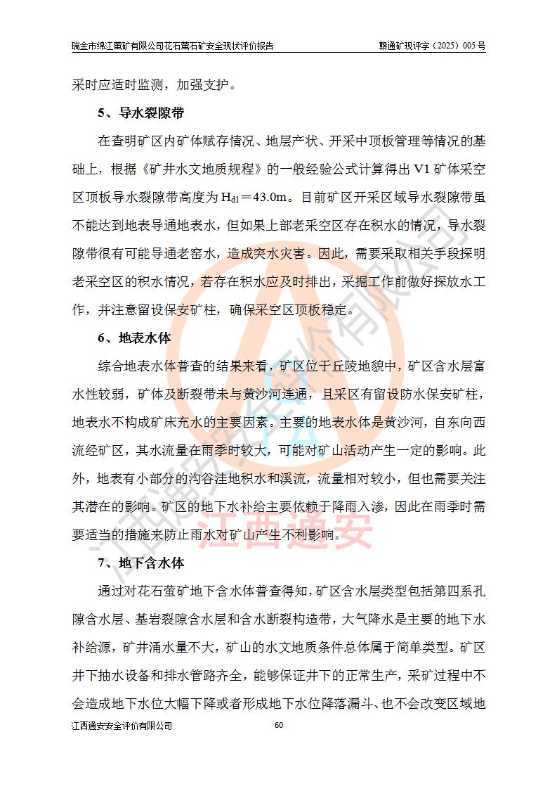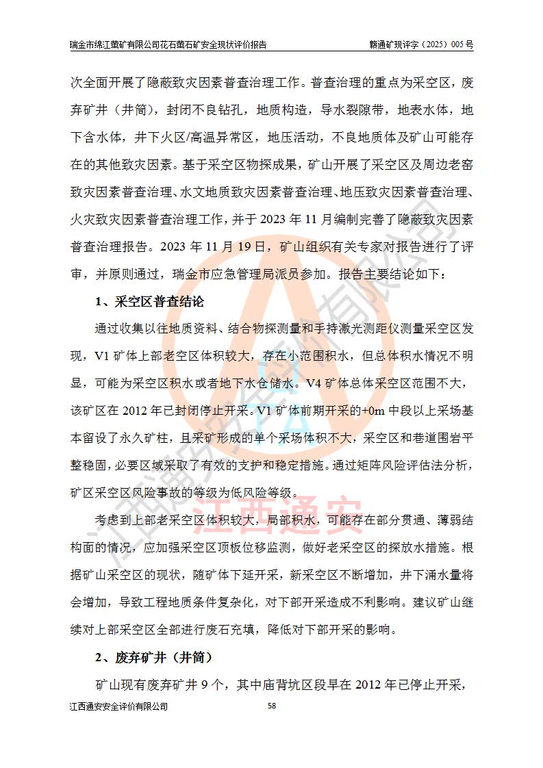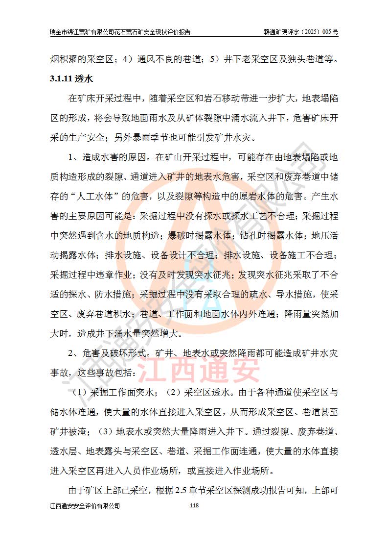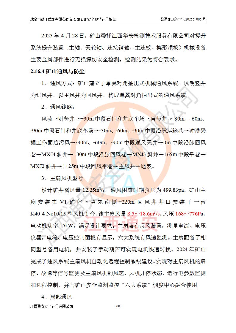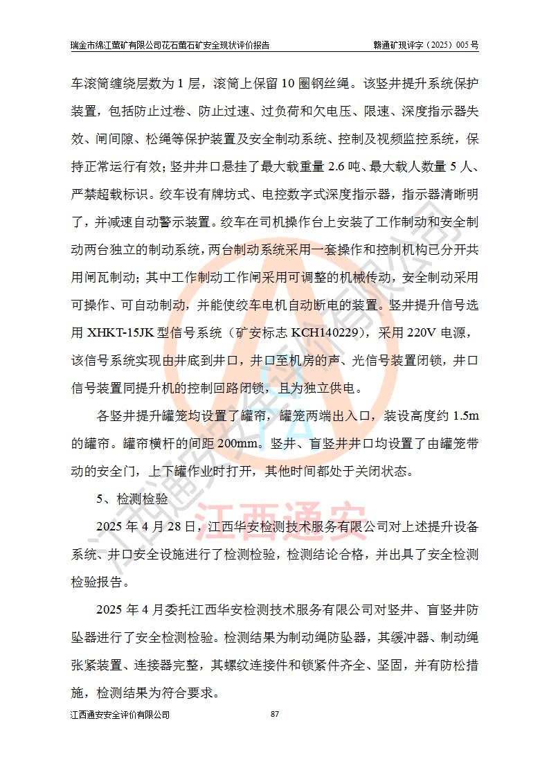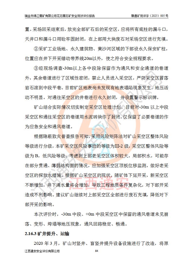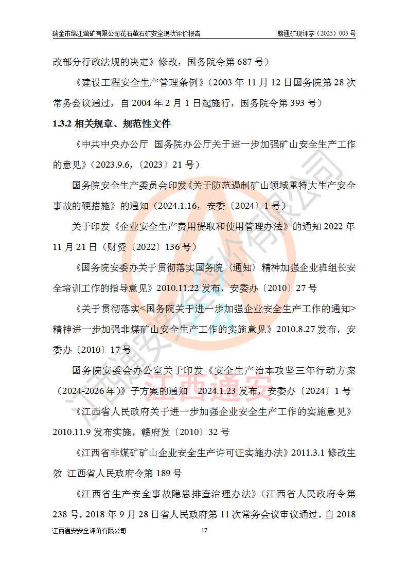 瑞金市綿江螢礦有限公司花石螢石礦區(qū)位于瑞金市南西215°方位直距30km處,礦區(qū)中心位置地理坐標(biāo)為東經(jīng)115°51′24″,北緯25°39′21″,行政區(qū)劃屬瑞金市謝坊鎮(zhèn)管轄。 礦山前身為瑞金市金鑫礦產(chǎn)品實(shí)業(yè)有限公司花石螢礦。為了進(jìn)一步穩(wěn)固螢石礦產(chǎn)業(yè)鏈,2024年9月瑞金市綿江螢礦有限公司申請(qǐng)將瑞金市金鑫礦產(chǎn)品實(shí)業(yè)有限公司花石螢礦采礦權(quán)**至其公司。2025年4月6日,花石螢石礦完成了采礦權(quán)人**手續(xù),并取得了新采礦許可證。 該螢石礦區(qū)開采始于上世紀(jì)九十年代,由當(dāng)?shù)孛癖娫诨ㄊV點(diǎn)和廟背坑礦點(diǎn)零星開采(廟背坑礦點(diǎn)位于花石礦點(diǎn)東側(cè),兩個(gè)礦點(diǎn)礦體直線距離約1km,廟背坑礦點(diǎn)已停止采礦活動(dòng)。本次評(píng)價(jià)對(duì)象為花石礦點(diǎn))。本世紀(jì)初,經(jīng)礦業(yè)秩序整頓、規(guī)范礦山開采,兩礦點(diǎn)分別由不同采礦權(quán)人依法辦理了采礦許可證,即廟背坑螢礦和花石螢石礦。2005年12月,根據(jù)贛州市人民**《贛市府辦發(fā)〔2005〕14號(hào)》文件有關(guān)礦業(yè)權(quán)整合的指示精神要求,兩個(gè)采礦權(quán)整合為一個(gè)采礦權(quán)人,即瑞金市金鑫礦產(chǎn)品實(shí)業(yè)有限公司,整合后采礦權(quán)面積2.4707km2,開采標(biāo)高+220m~0m。整合后,2011年8月,花石螢石礦委托江西省冶金設(shè)計(jì)院有限責(zé)任公司編制了《瑞金市金鑫礦產(chǎn)品實(shí)業(yè)有限公司花石螢礦地下開采整改初步設(shè)計(jì)安全專篇》。整改設(shè)計(jì)開采對(duì)象為花石區(qū)段V1礦體,采用豎井+盲豎井聯(lián)合開拓,主要井筒為SJ3豎井、MJ1盲豎井,SJ3豎井連接+125m中段,采用JTP-1.2×1.0型礦用提升絞車提升,MJ1盲豎井連接+65m中段、+83m中段,采用JTK-1.0×0.8型塊式制動(dòng)礦用提升絞車提升。設(shè)計(jì)開采深度+220m至+67m標(biāo)高,共布置+125m、+83m、+65m三個(gè)中段;設(shè)計(jì)生產(chǎn)規(guī)模為4萬噸/年,采礦方法選用淺孔留礦法。 根據(jù)整改設(shè)計(jì)要求,礦山經(jīng)過近一年多的整改施工,2012年9月通過由原贛州市安全生產(chǎn)監(jiān)督管理局組織的安全設(shè)施整改驗(yàn)收。2012年9月26日取得了由原江西省安全生產(chǎn)監(jiān)督管理局延期換發(fā)的《安全生產(chǎn)許可證》(編號(hào):FM安許證字[2005]M0033號(hào)),許可范圍:螢石礦4萬噸/年,豎井+盲豎井聯(lián)合開拓,+67m中段地下開采。 由于原整改設(shè)計(jì)范圍內(nèi)(+67m以上中段)V1礦體資源儲(chǔ)量無法使礦井達(dá)到持續(xù)穩(wěn)定的生產(chǎn)接替,根據(jù)2011年11月264核工業(yè)大隊(duì)《江西省瑞金市花石螢石礦資源儲(chǔ)量核實(shí)報(bào)告》及礦山提交的2013年度資源儲(chǔ)量動(dòng)態(tài)檢測(cè)報(bào)告。2013年4月,花石螢石礦又委托江西省冶金設(shè)計(jì)院有限責(zé)任公司為其編制了《瑞金市金鑫礦產(chǎn)品實(shí)業(yè)有限公司花石螢礦花石礦區(qū)地下開采改建工程初步設(shè)計(jì)安全專篇》。設(shè)計(jì)開采范圍+83m~+0m標(biāo)高;采用豎井開拓。設(shè)計(jì)新建開拓工程為新豎井及+83m、+40m、+0m三個(gè)中段。采礦方法為淺孔留礦法。 由于部分工程與設(shè)計(jì)不符。2014年10月,礦山委托江西省冶金設(shè)計(jì)院有限責(zé)任公司編制了《瑞金市金鑫礦產(chǎn)品實(shí)業(yè)有限公司花石螢礦花石礦區(qū)地下開采改建工程變更設(shè)計(jì)》,其中段布置變更為+30m、+0m中段;通風(fēng)系統(tǒng)變更為以新豎井為進(jìn)風(fēng)井;采用SJ3北東已有的平峒(PD)及平硐內(nèi)的人行、回風(fēng)斜巷MXJ1、MXJ2 、MXJ3并配置相關(guān)工程后作為礦區(qū)北東翼礦體開采的北東翼回風(fēng)系統(tǒng)。主扇安裝于+190m中段回風(fēng)道。 2015年9月,礦山改建工程安全設(shè)施通過了原江西省安全生產(chǎn)監(jiān)督管理局組織專家組竣工驗(yàn)收,并取得了原江西省安監(jiān)局延期換發(fā)的《安全生產(chǎn)許可證》(編號(hào):FM安許證字[2005]M0033號(hào)),許可范圍:螢石礦4萬噸/年,豎井開拓,+30m、0m中段地下開采。 花石螢礦V1礦體經(jīng)過多年開采后,原改建工程設(shè)計(jì)范圍內(nèi)(+0m以上中段)螢石礦資源儲(chǔ)量日漸減少。為了擴(kuò)大礦區(qū)資源儲(chǔ)量,延長(zhǎng)礦山服務(wù)年限,查明礦區(qū)深部螢石礦資源儲(chǔ)量。2014年礦山申請(qǐng)了采礦權(quán)變更開采深度的請(qǐng)示。2015年1月16日礦山取得了原贛州市礦產(chǎn)資源管理局頒發(fā)的劃定礦區(qū)范圍批復(fù)(贛市礦劃復(fù)[2015]0001號(hào)),劃定礦區(qū)范圍面積2.47km2,礦區(qū)范圍由7個(gè)拐點(diǎn)圈定,開采深度由+220m~-150m。同年,礦山委托江西省核工業(yè)地質(zhì)局二六四大隊(duì)編制完成了《江西省瑞金市花石螢石礦區(qū)資源儲(chǔ)量核實(shí)報(bào)告》并經(jīng)過了贛州市金輝礦業(yè)技術(shù)服務(wù)有限公司評(píng)審(贛金輝儲(chǔ)審字[2014]12號(hào)),原贛州市礦產(chǎn)資源管理局以“贛市礦儲(chǔ)備字[2014]18號(hào))”文對(duì)該報(bào)告?zhèn)浒浮?/span> 為了使礦井達(dá)到持續(xù)穩(wěn)定的生產(chǎn)接替,保持三級(jí)礦量平衡,2015年7月委托了江西省冶金設(shè)計(jì)院有