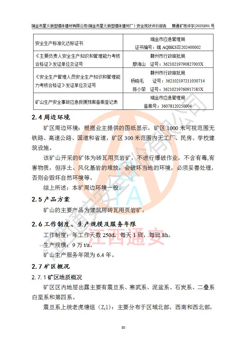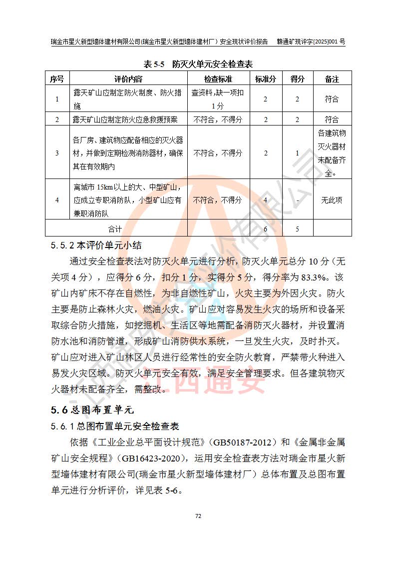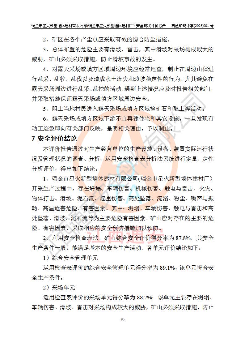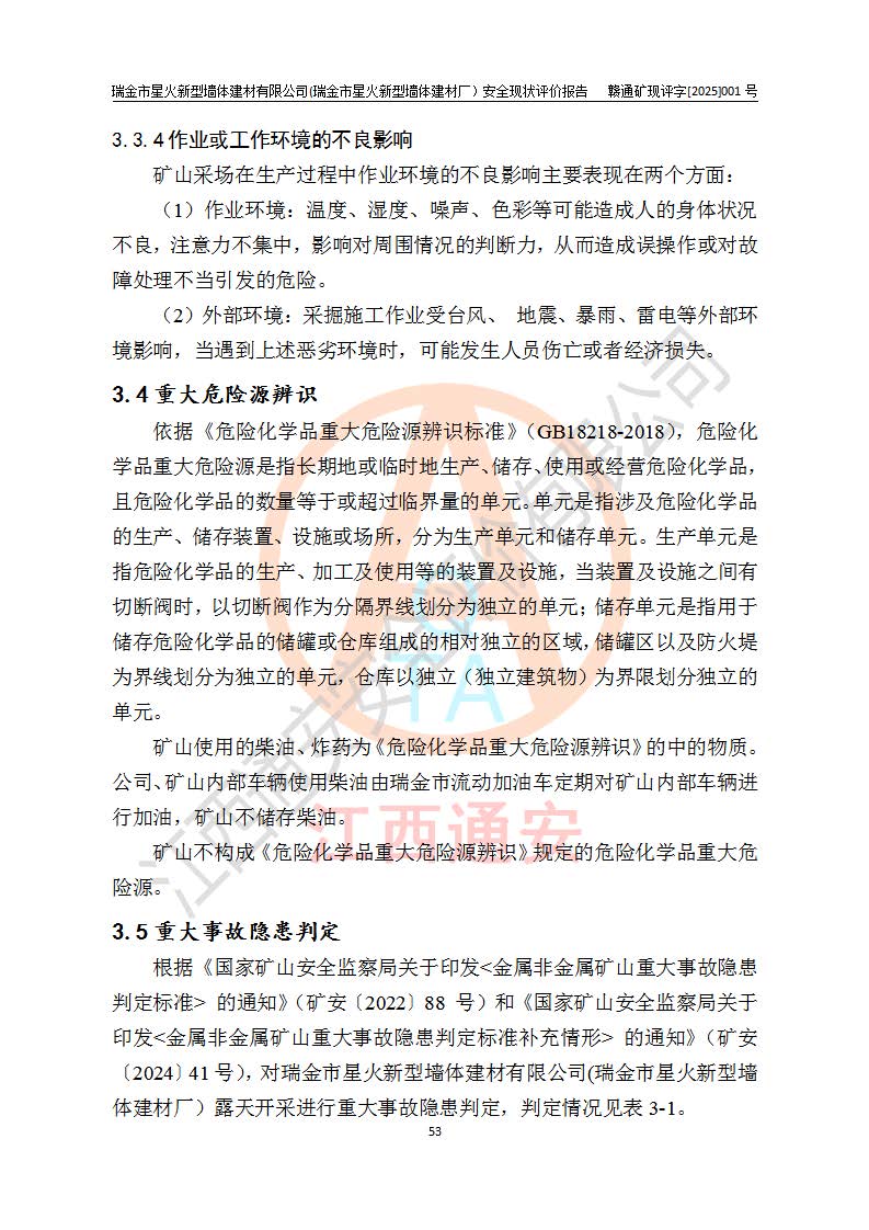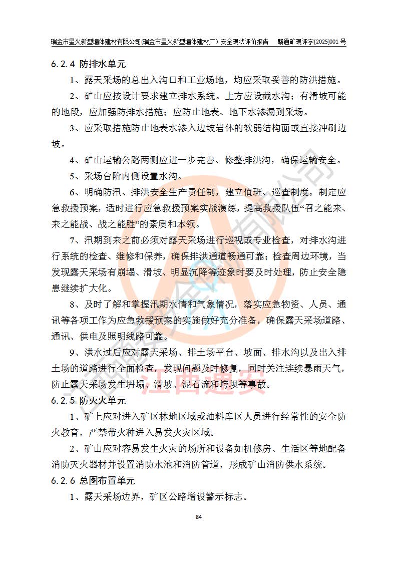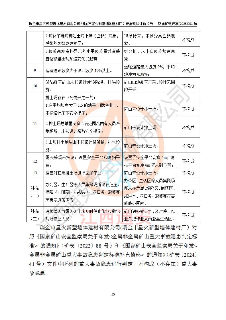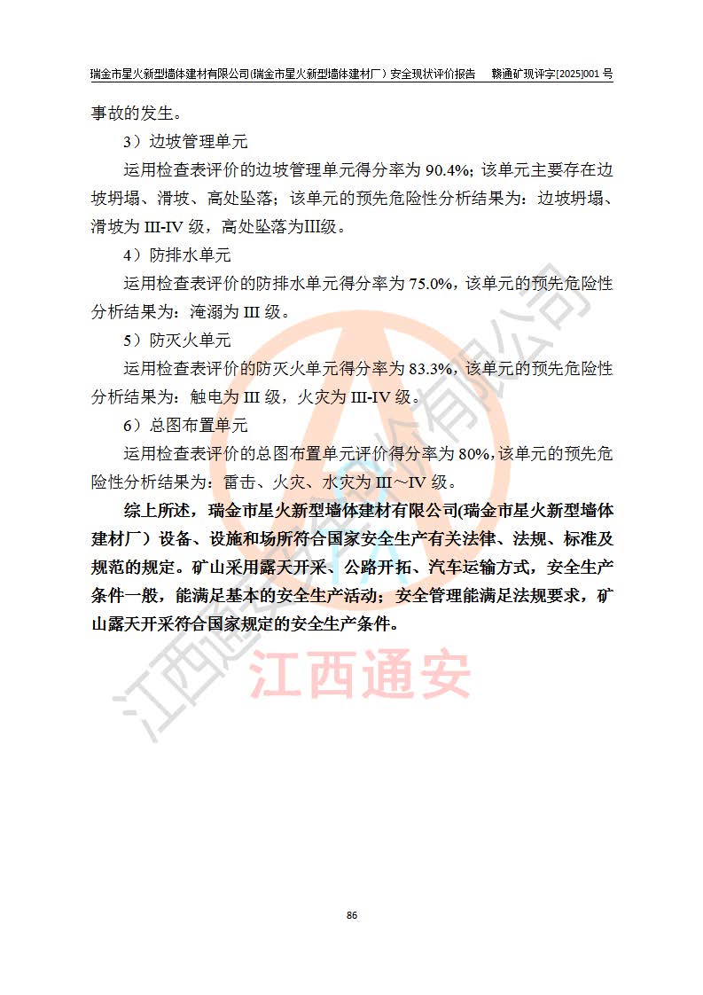 其它 | 瑞金市星火新型墻體建材有限公司(瑞金市星火新型墻體建材廠)設(shè)備、設(shè)施和場(chǎng)所基本符合**安全生產(chǎn)有關(guān)法律、法規(guī)、標(biāo)準(zhǔn)及規(guī)范的規(guī)定。礦山采用露天開采公路開拓汽車運(yùn)輸方式,安全生產(chǎn)條件良好,生產(chǎn)活動(dòng)有安全保障;安全管理能滿足法規(guī)要求,礦山露天開采符合**規(guī)定的安全生產(chǎn)條件。 | ||||