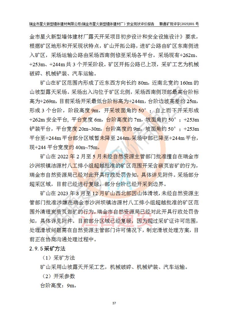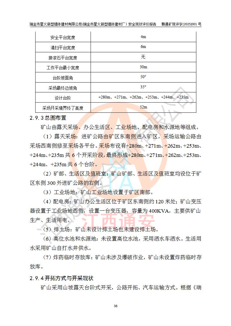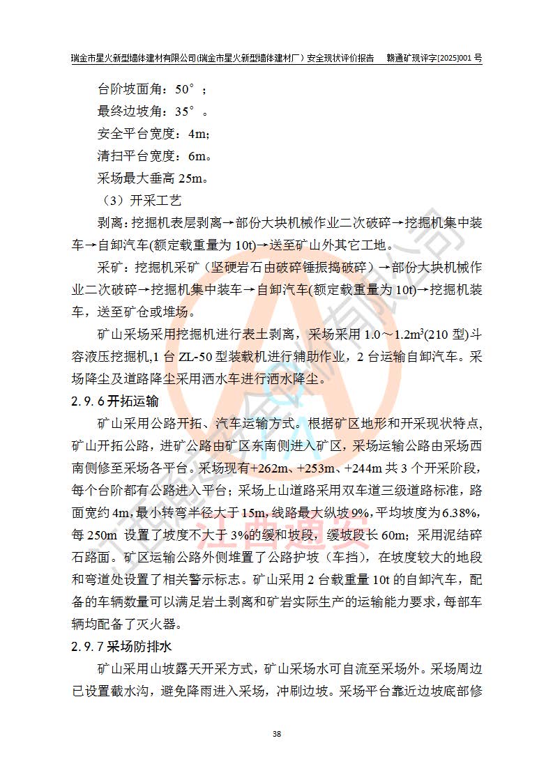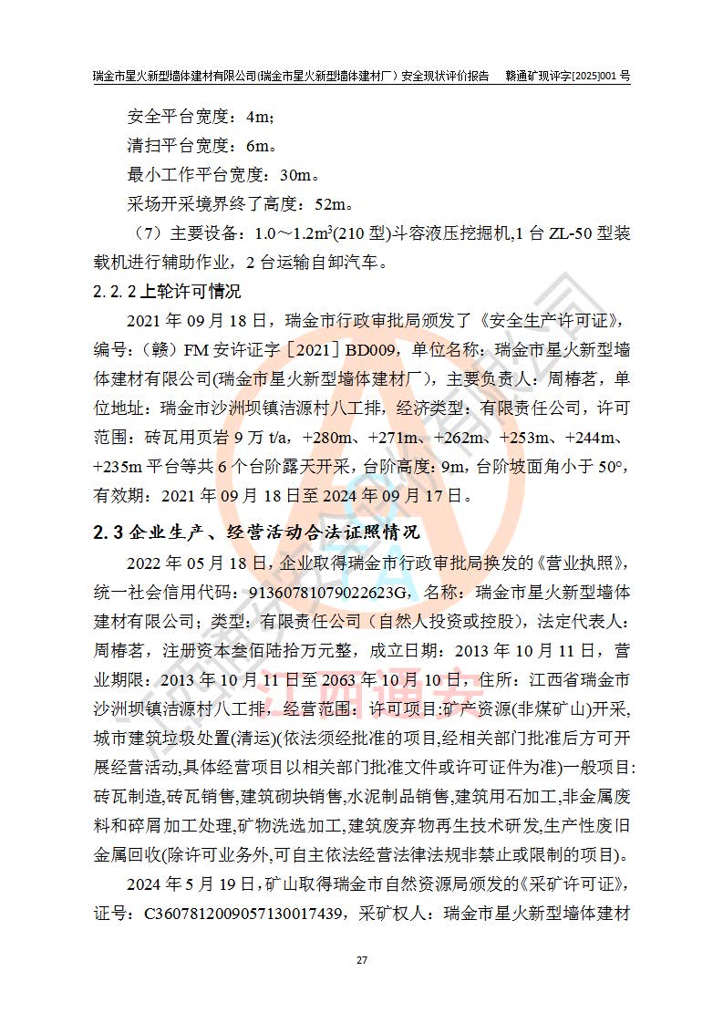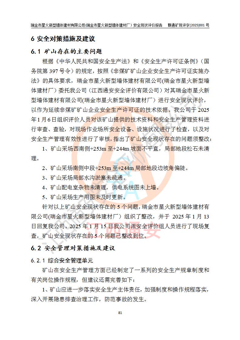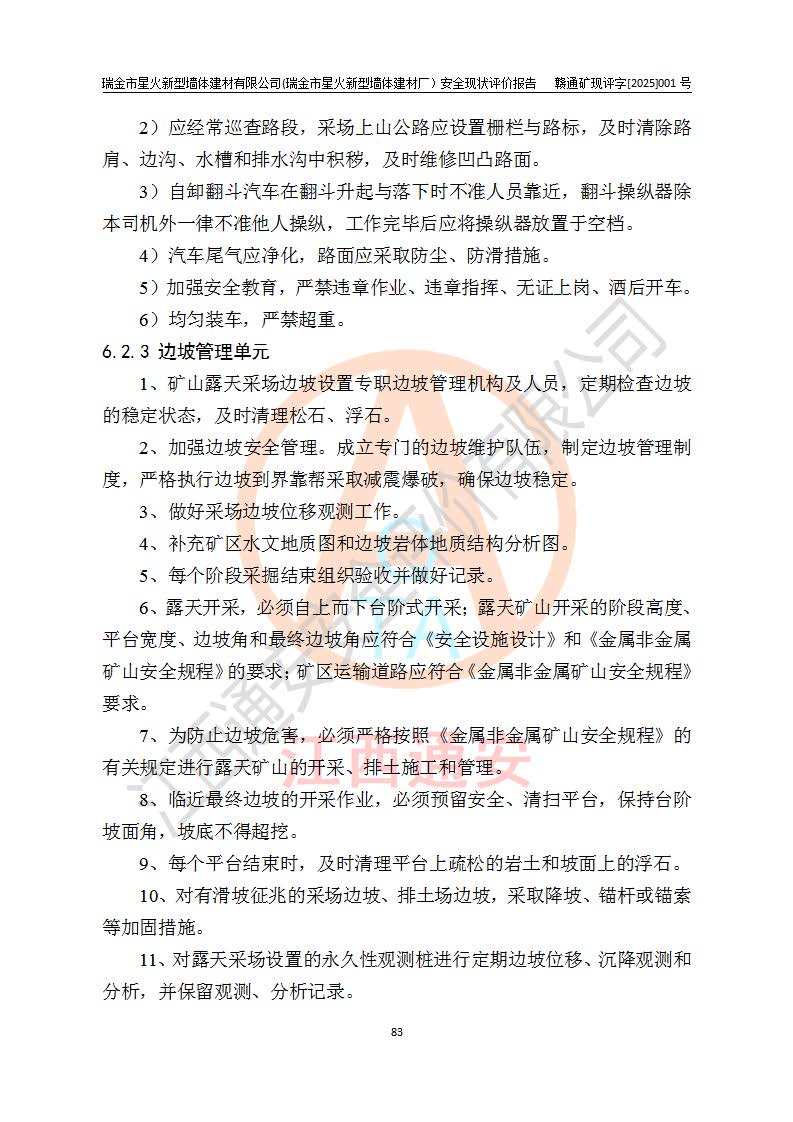 其它 | 瑞金市星火新型墻體建材有限公司(瑞金市星火新型墻體建材廠)設(shè)備、設(shè)施和場(chǎng)所基本符合**安全生產(chǎn)有關(guān)法律、法規(guī)、標(biāo)準(zhǔn)及規(guī)范的規(guī)定。礦山采用露天開采公路開拓汽車運(yùn)輸方式,安全生產(chǎn)條件良好,生產(chǎn)活動(dòng)有安全保障;安全管理能滿足法規(guī)要求,礦山露天開采符合**規(guī)定的安全生產(chǎn)條件。 | ||||