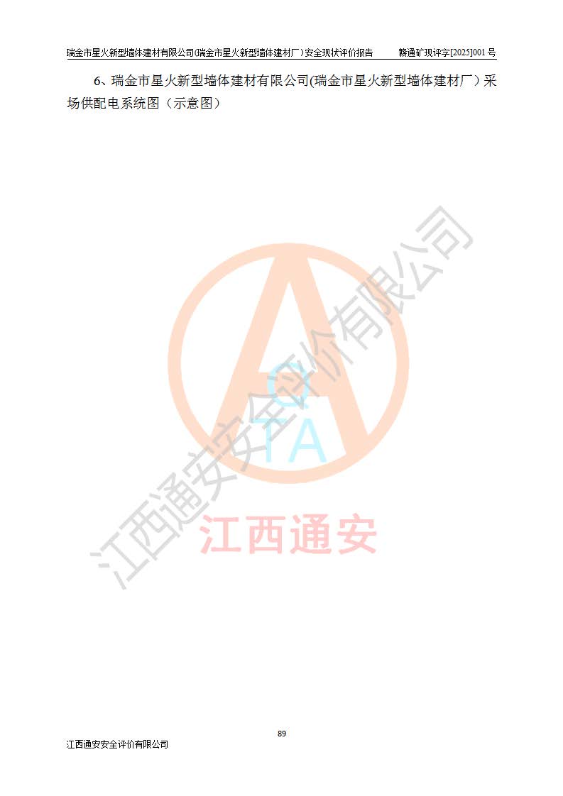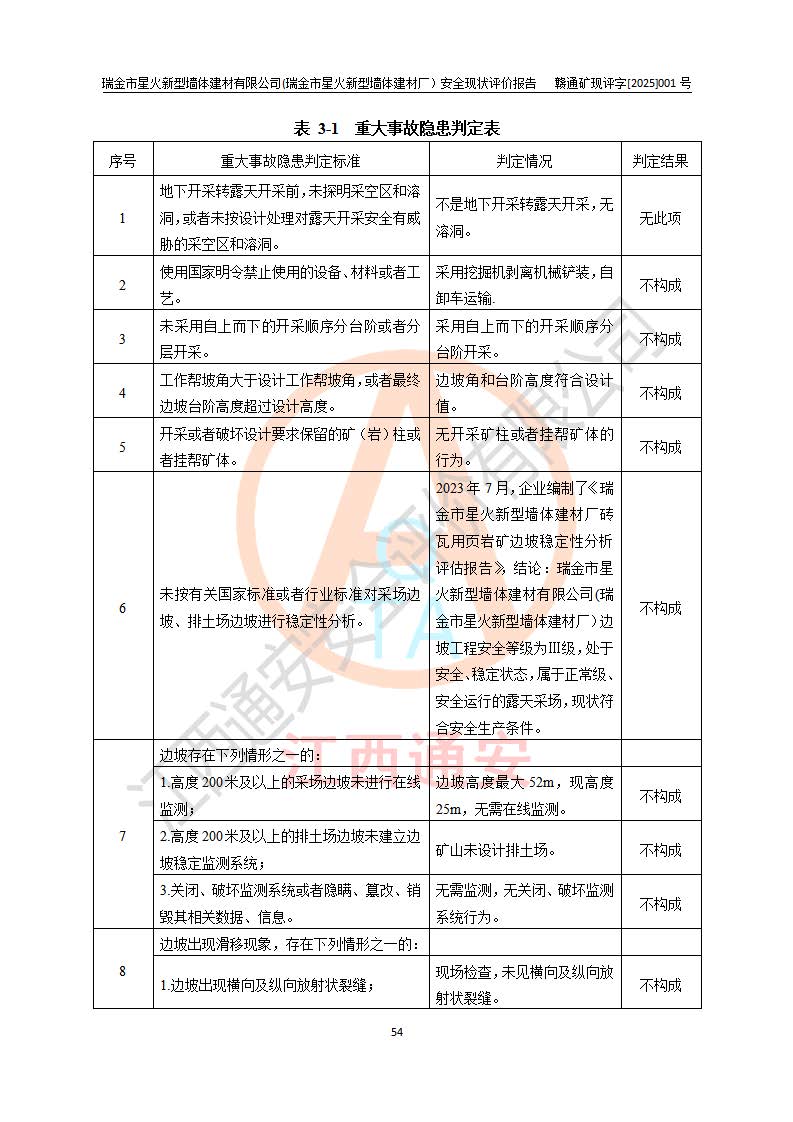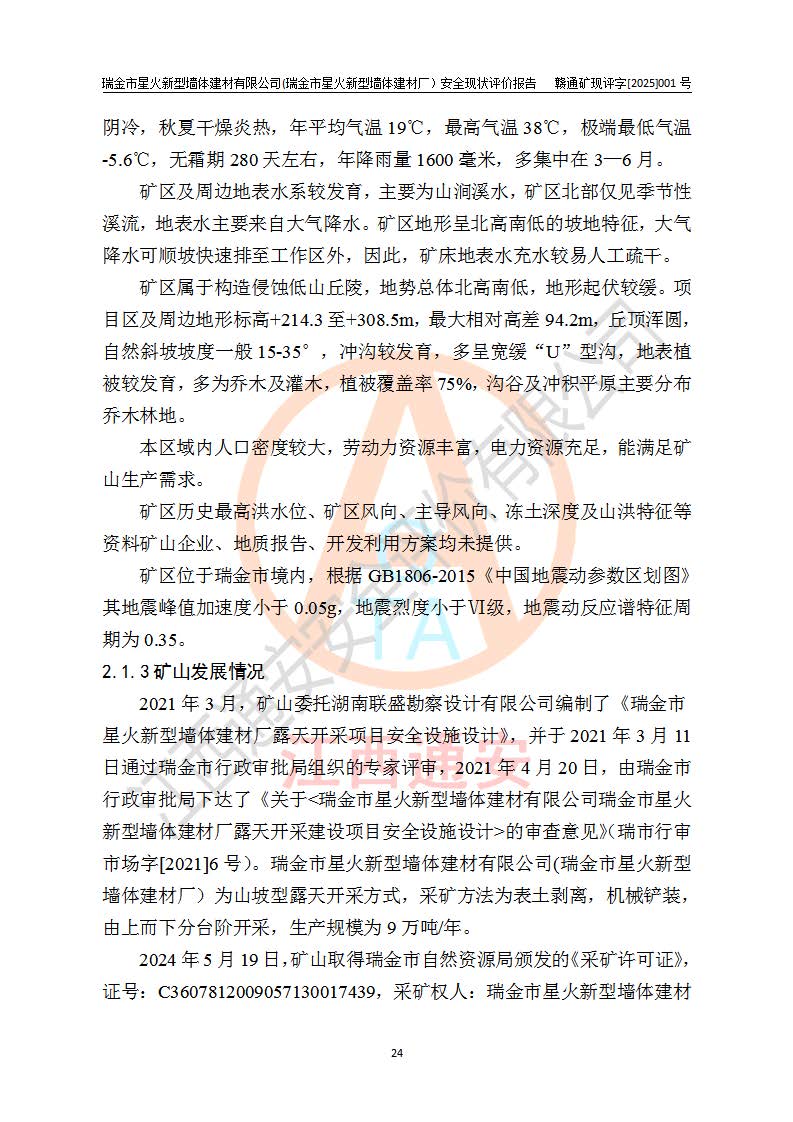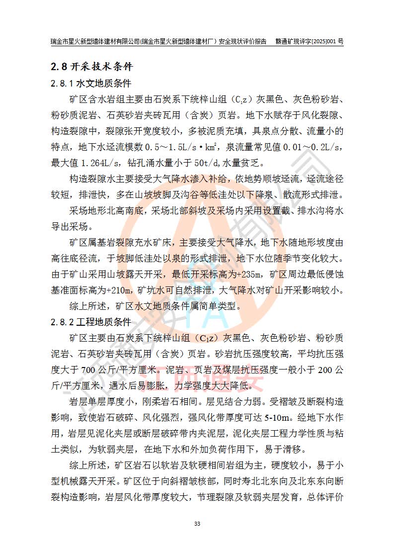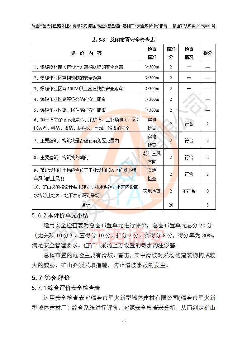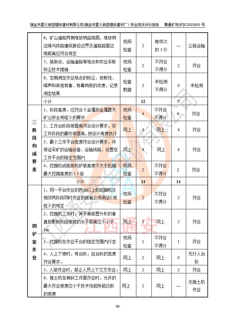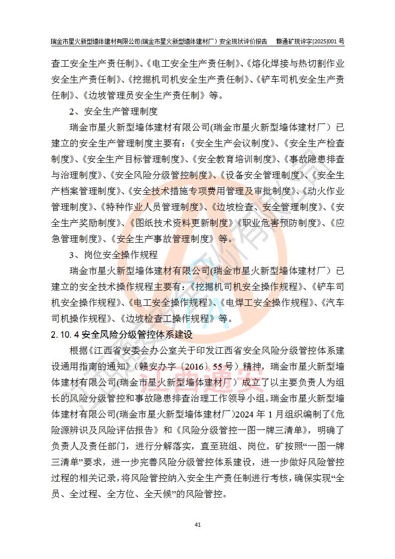 其它 | 瑞金市星火新型墻體建材有限公司(瑞金市星火新型墻體建材廠)設(shè)備、設(shè)施和場(chǎng)所基本符合**安全生產(chǎn)有關(guān)法律、法規(guī)、標(biāo)準(zhǔn)及規(guī)范的規(guī)定。礦山采用露天開采公路開拓汽車運(yùn)輸方式,安全生產(chǎn)條件良好,生產(chǎn)活動(dòng)有安全保障;安全管理能滿足法規(guī)要求,礦山露天開采符合**規(guī)定的安全生產(chǎn)條件。 | ||||