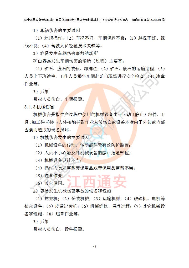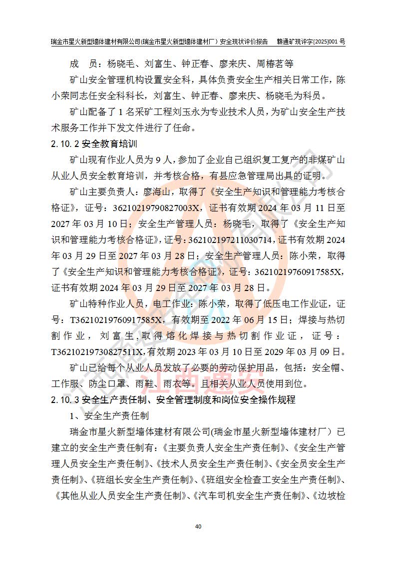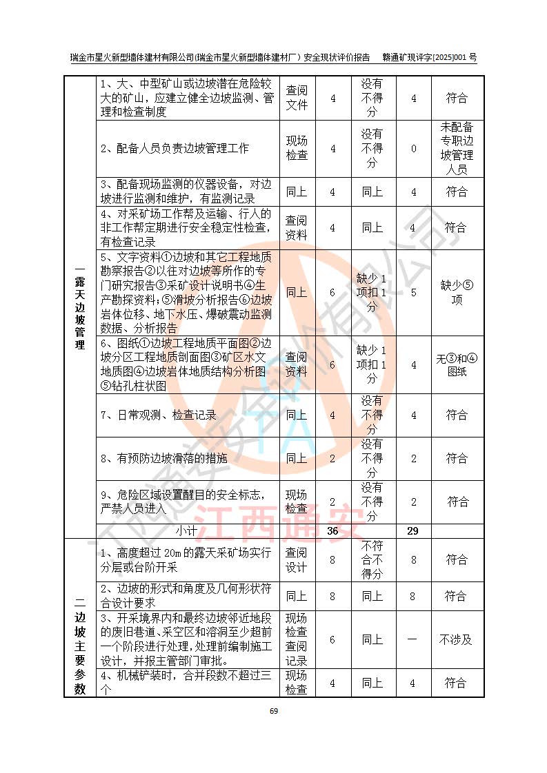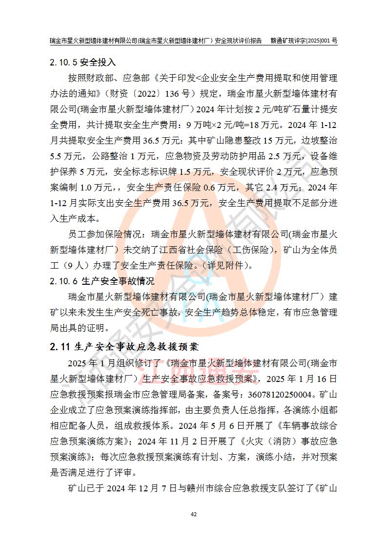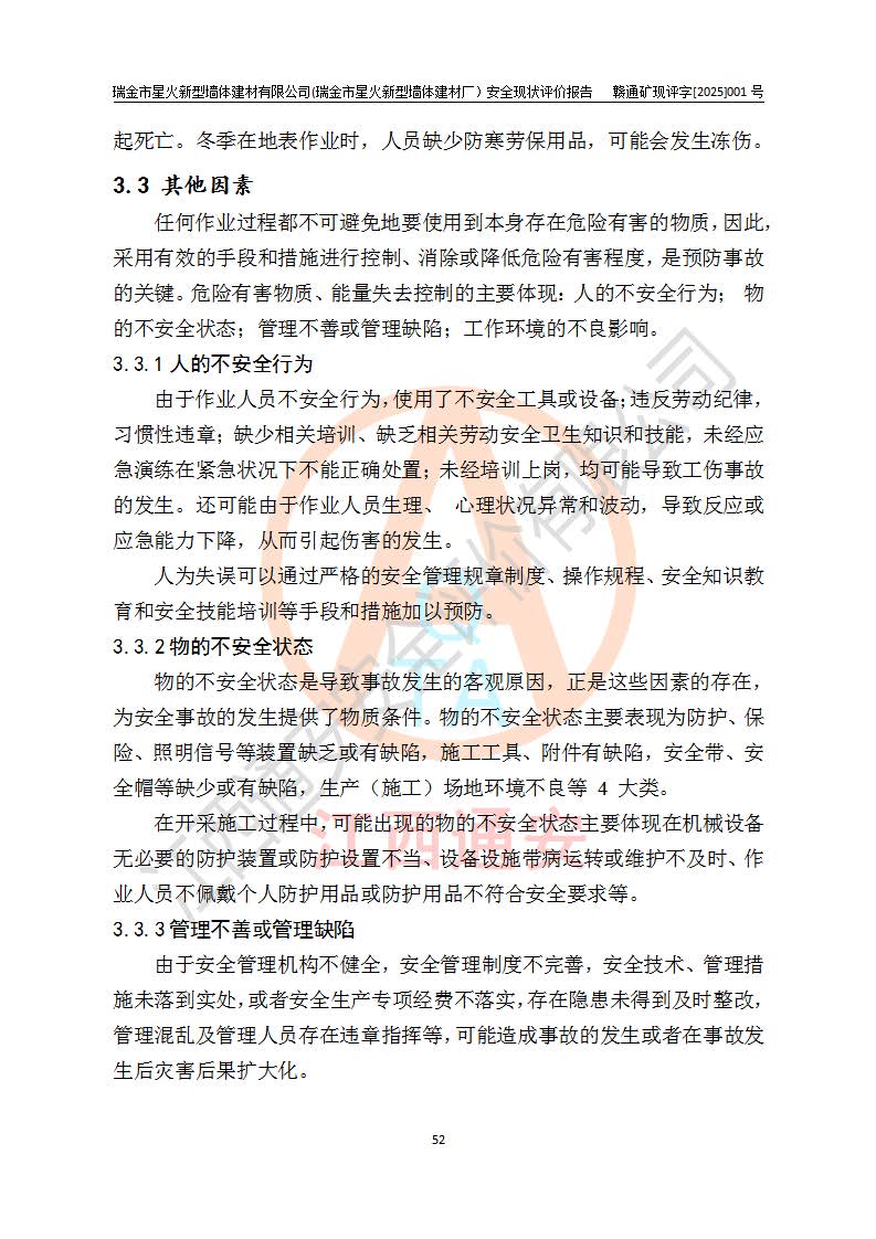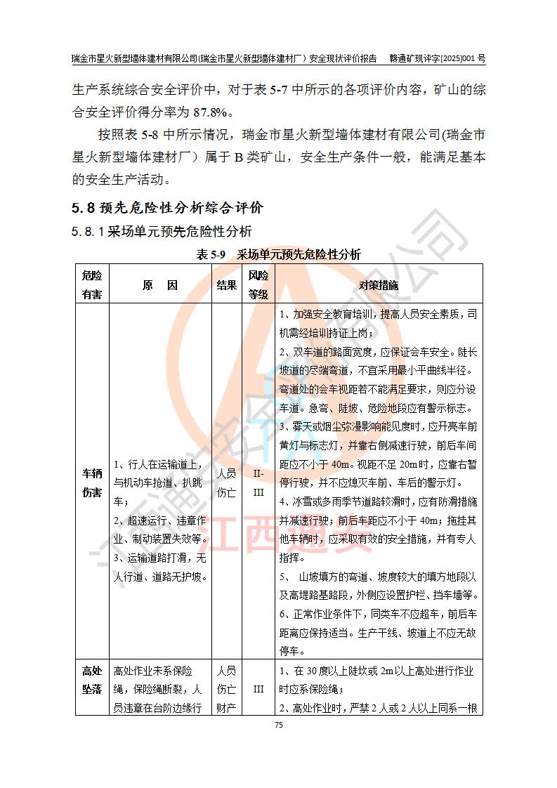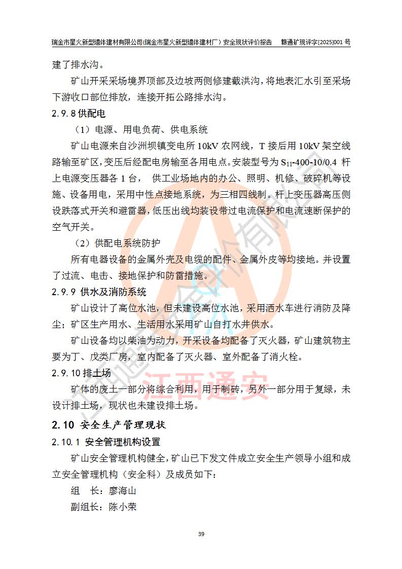 其它 | 瑞金市星火新型墻體建材有限公司(瑞金市星火新型墻體建材廠)設(shè)備、設(shè)施和場(chǎng)所基本符合**安全生產(chǎn)有關(guān)法律、法規(guī)、標(biāo)準(zhǔn)及規(guī)范的規(guī)定。礦山采用露天開采公路開拓汽車運(yùn)輸方式,安全生產(chǎn)條件良好,生產(chǎn)活動(dòng)有安全保障;安全管理能滿足法規(guī)要求,礦山露天開采符合**規(guī)定的安全生產(chǎn)條件。 | ||||