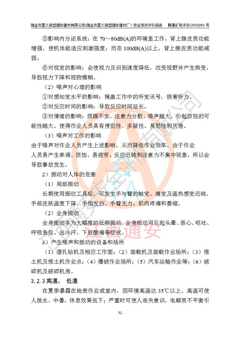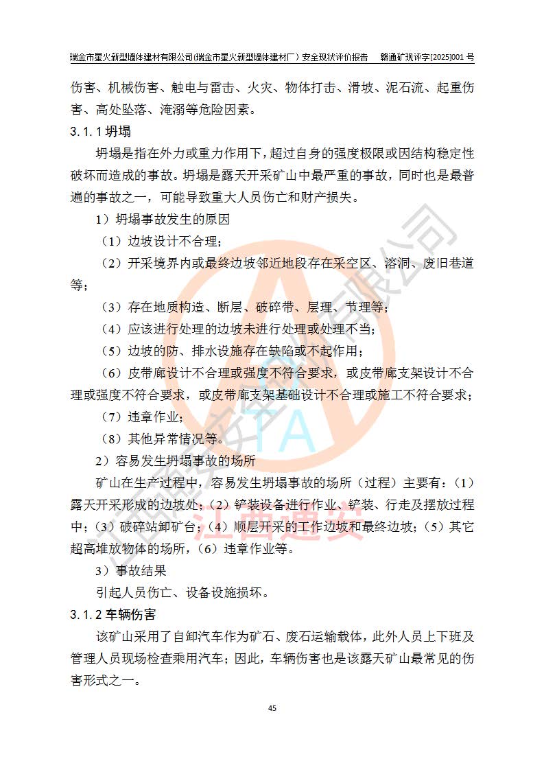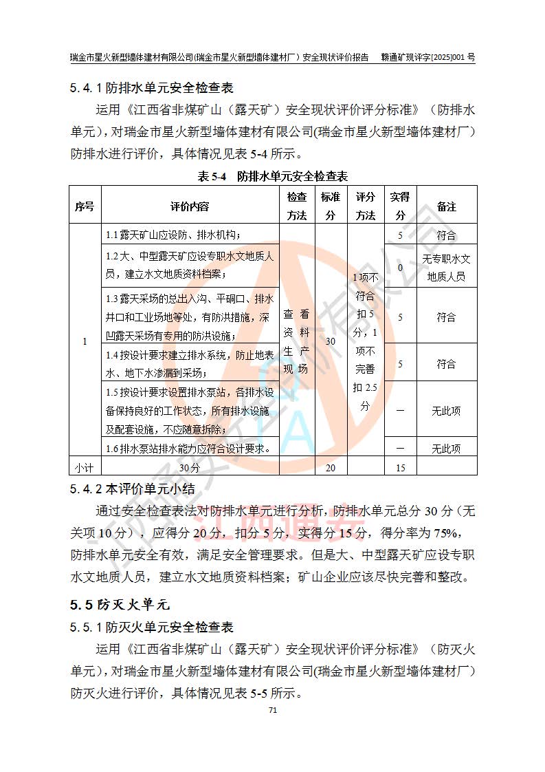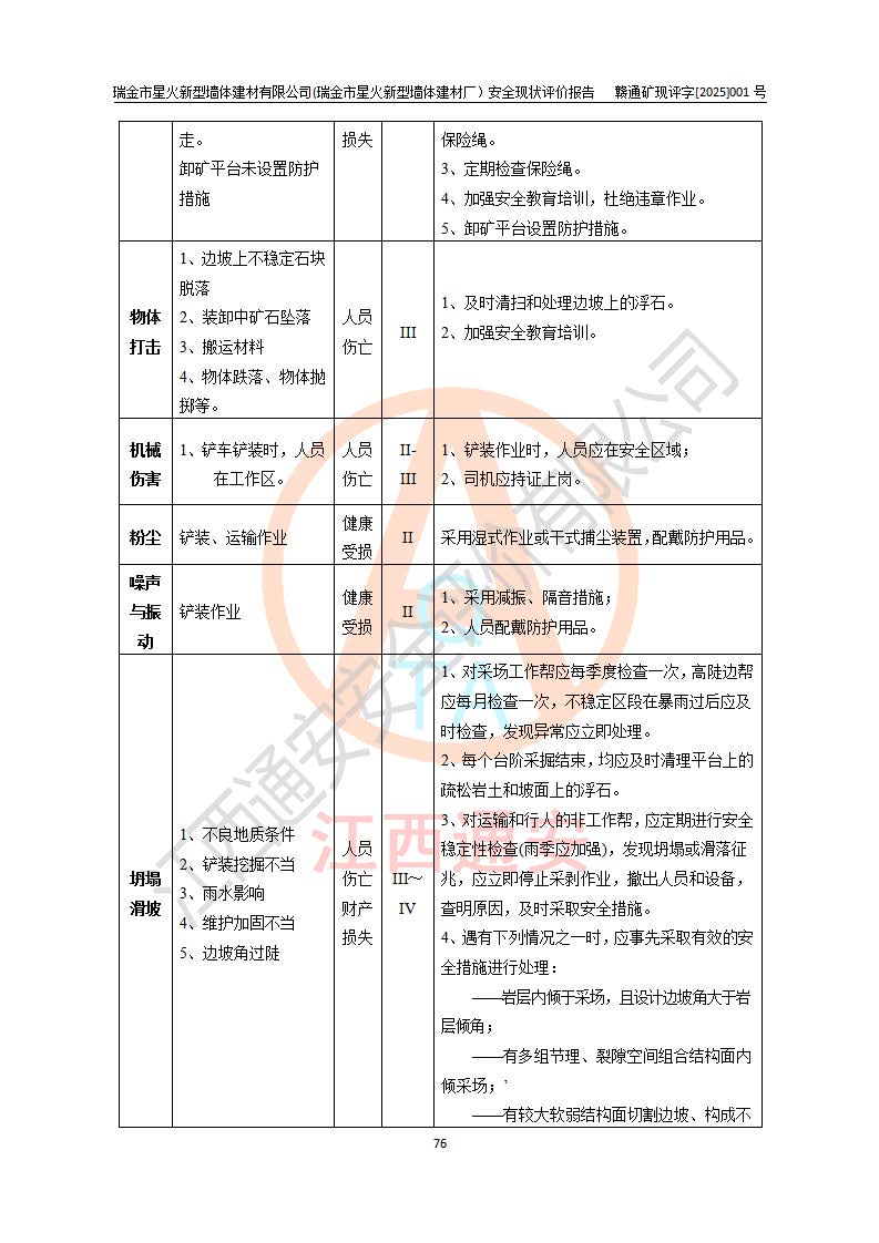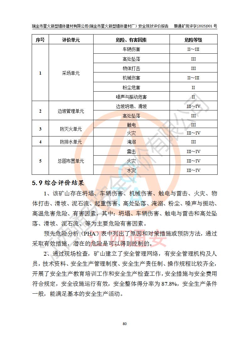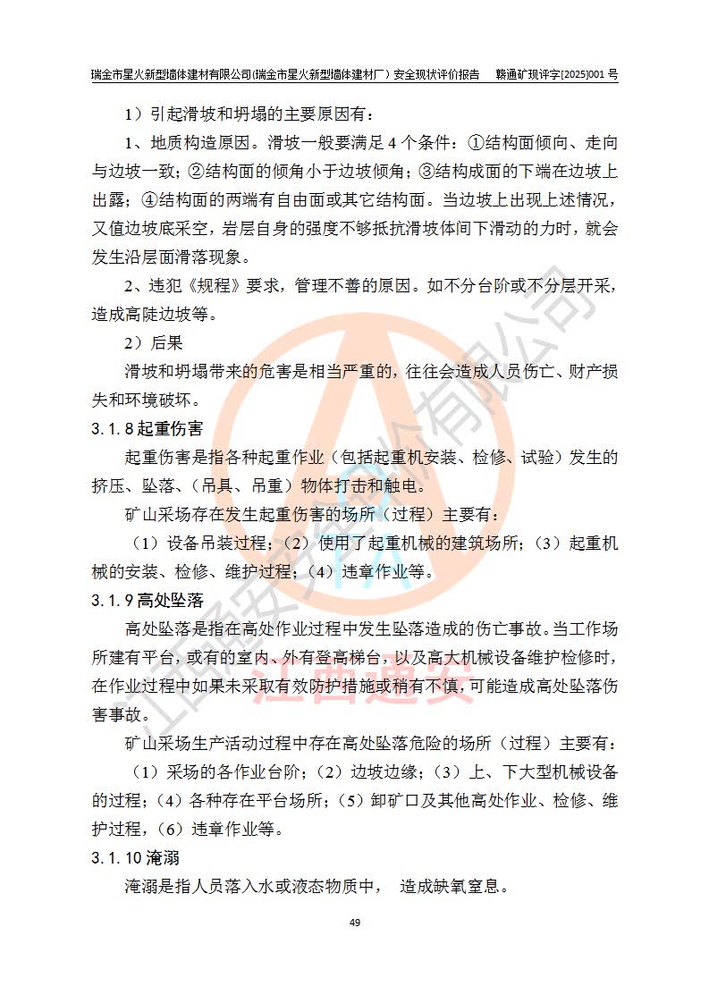 其它 | 瑞金市星火新型墻體建材有限公司(瑞金市星火新型墻體建材廠)設(shè)備、設(shè)施和場(chǎng)所基本符合**安全生產(chǎn)有關(guān)法律、法規(guī)、標(biāo)準(zhǔn)及規(guī)范的規(guī)定。礦山采用露天開采公路開拓汽車運(yùn)輸方式,安全生產(chǎn)條件良好,生產(chǎn)活動(dòng)有安全保障;安全管理能滿足法規(guī)要求,礦山露天開采符合**規(guī)定的安全生產(chǎn)條件。 | ||||