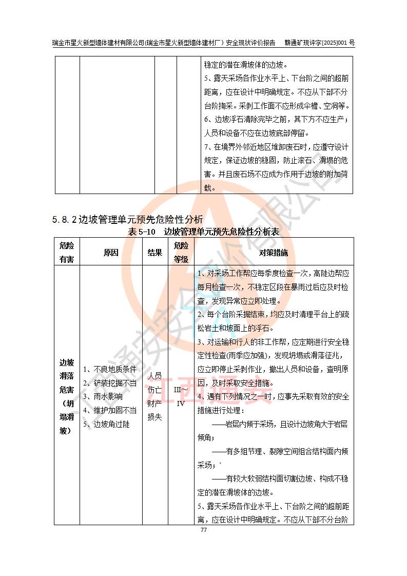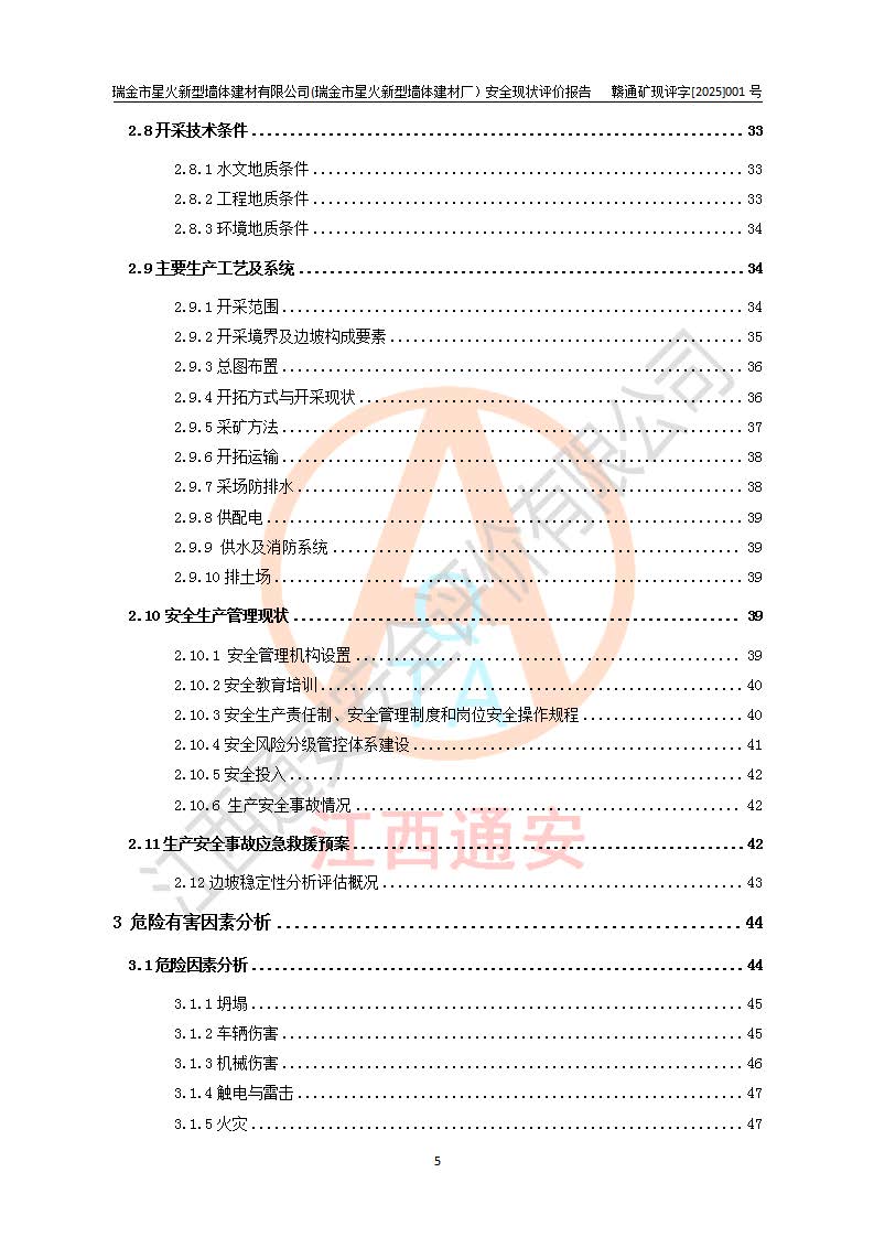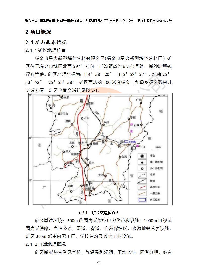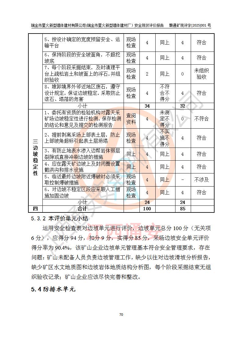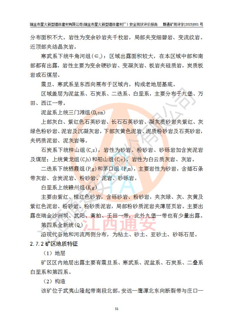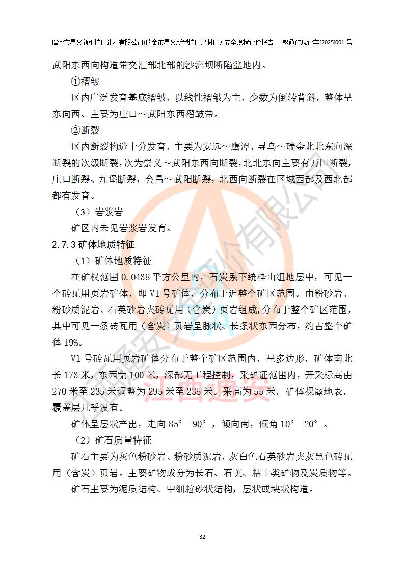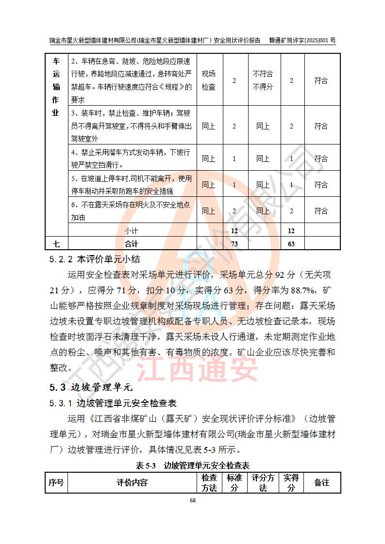 其它 | 瑞金市星火新型墻體建材有限公司(瑞金市星火新型墻體建材廠)設(shè)備、設(shè)施和場(chǎng)所基本符合**安全生產(chǎn)有關(guān)法律、法規(guī)、標(biāo)準(zhǔn)及規(guī)范的規(guī)定。礦山采用露天開采公路開拓汽車運(yùn)輸方式,安全生產(chǎn)條件良好,生產(chǎn)活動(dòng)有安全保障;安全管理能滿足法規(guī)要求,礦山露天開采符合**規(guī)定的安全生產(chǎn)條件。 | ||||