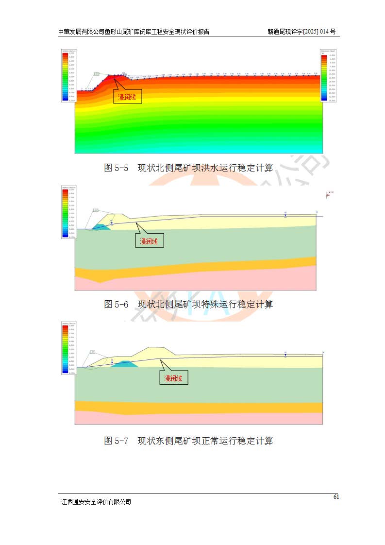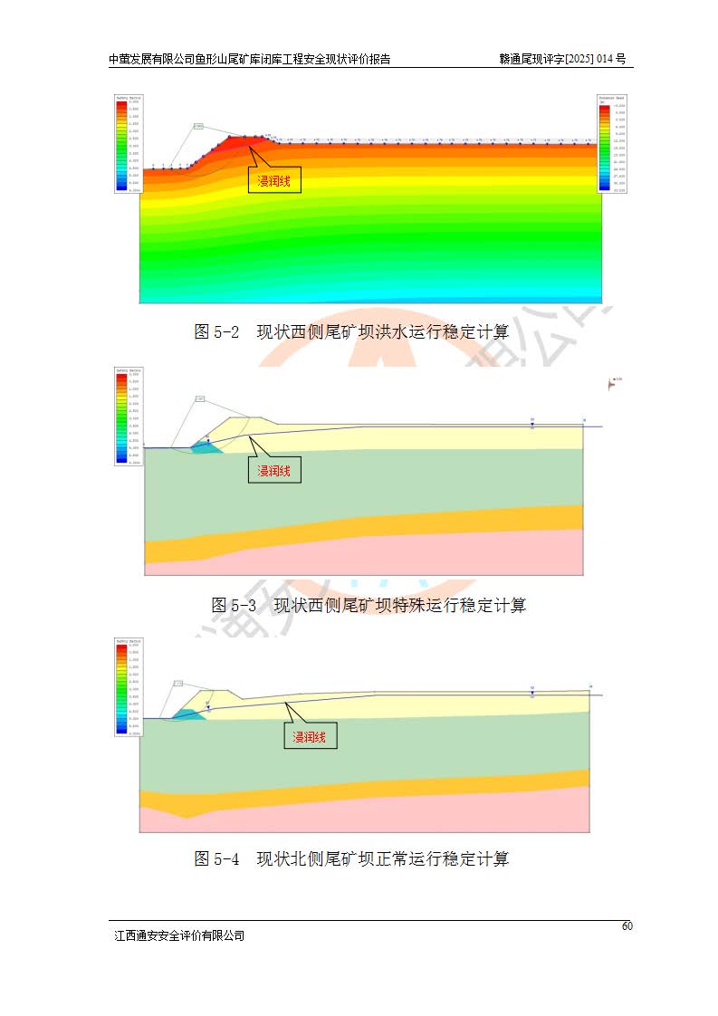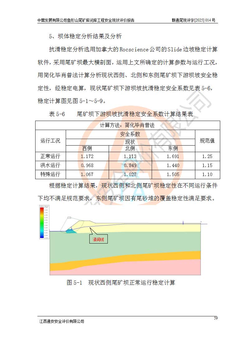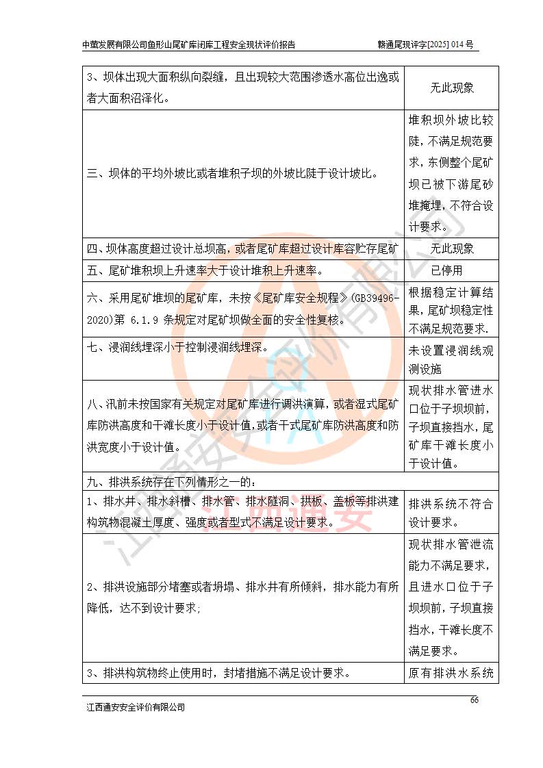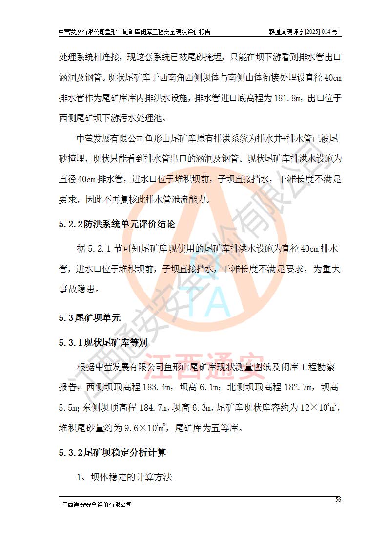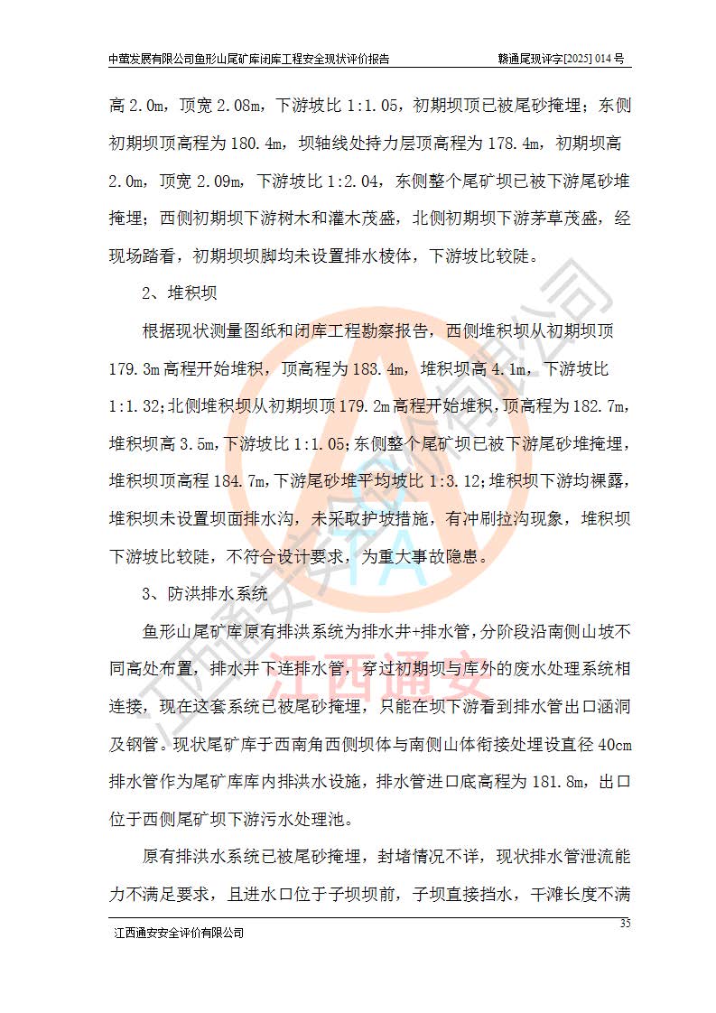 存在的問題: 1、初期壩未設(shè)置排水棱體,下游坡比較陡,初期壩壩頂被尾砂掩埋,尾礦壩穩(wěn)定性不滿足規(guī)范要求; 2、堆積壩外坡比較陡,不滿足規(guī)范要求,東側(cè)整個尾礦壩已被下游尾砂堆掩埋,堆積壩未設(shè)置壩面排水溝,未采取護(hù)坡措施,有沖刷拉溝現(xiàn)象; 3、原有排洪水系統(tǒng)已被尾砂掩埋,封堵情況不詳,現(xiàn)狀排水管泄流能力不滿足要求,且進(jìn)水口位于子壩壩前,子壩直接擋水,干灘長度不滿足要求; 4、尾礦壩上未設(shè)置安全監(jiān)測設(shè)施,安全標(biāo)志偏少; 5、未按設(shè)計進(jìn)行尾砂回采,在庫內(nèi)形成積水坑,且積水坑內(nèi)積水無法排出; 6、尾礦庫不再進(jìn)行尾砂回采,也不再使用,應(yīng)進(jìn)行閉庫。 整改措施: 1、在初期壩下游增設(shè)干砌塊石貼坡排水體,增加壩體穩(wěn)定性,在北側(cè)和東側(cè)初期壩壩腳增設(shè)壩腳排水溝。 2、對堆積壩削坡,增加壩體的穩(wěn)定性,削坡后覆土植草皮護(hù)坡,修建壩面壩肩排水溝。 3、新建溢洪道用于閉庫后尾礦庫排洪排水,拆除現(xiàn)有排水管;對原排洪系統(tǒng)進(jìn)行封堵。 4、閉庫時在尾礦壩上增設(shè)安全監(jiān)測設(shè)施,增設(shè)安全標(biāo)志。 5、對庫內(nèi)積水坑進(jìn)行平整。 6、應(yīng)進(jìn)行閉庫,整治尾礦庫庫內(nèi)干灘面,為防止干灘面水土流失,覆土植草,覆土范圍為整個庫區(qū)范圍。在庫內(nèi)干灘面設(shè)置庫面排水溝,截洪溝、新建溢洪道,形成庫內(nèi)排水網(wǎng),能**的將庫內(nèi)雨水排至庫外。 |