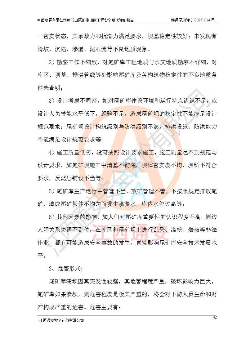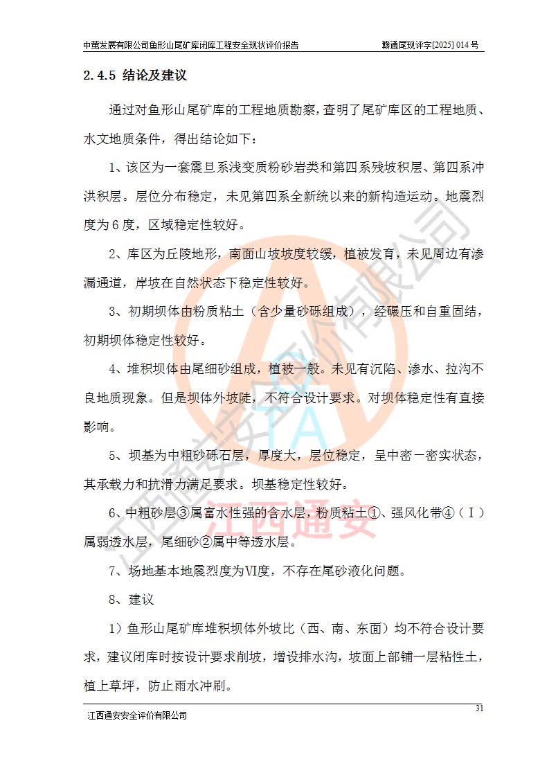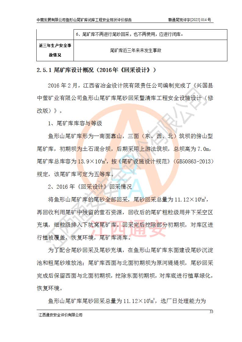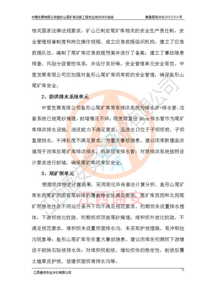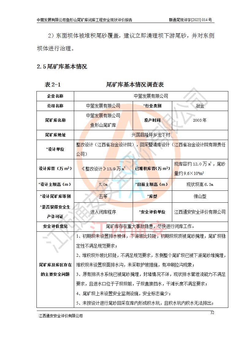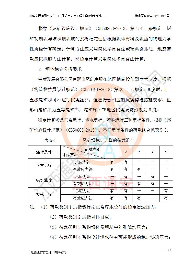 存在的問題: 1、初期壩未設(shè)置排水棱體,下游坡比較陡,初期壩壩頂被尾砂掩埋,尾礦壩穩(wěn)定性不滿足規(guī)范要求; 2、堆積壩外坡比較陡,不滿足規(guī)范要求,東側(cè)整個尾礦壩已被下游尾砂堆掩埋,堆積壩未設(shè)置壩面排水溝,未采取護(hù)坡措施,有沖刷拉溝現(xiàn)象; 3、原有排洪水系統(tǒng)已被尾砂掩埋,封堵情況不詳,現(xiàn)狀排水管泄流能力不滿足要求,且進(jìn)水口位于子壩壩前,子壩直接擋水,干灘長度不滿足要求; 4、尾礦壩上未設(shè)置安全監(jiān)測設(shè)施,安全標(biāo)志偏少; 5、未按設(shè)計進(jìn)行尾砂回采,在庫內(nèi)形成積水坑,且積水坑內(nèi)積水無法排出; 6、尾礦庫不再進(jìn)行尾砂回采,也不再使用,應(yīng)進(jìn)行閉庫。 整改措施: 1、在初期壩下游增設(shè)干砌塊石貼坡排水體,增加壩體穩(wěn)定性,在北側(cè)和東側(cè)初期壩壩腳增設(shè)壩腳排水溝。 2、對堆積壩削坡,增加壩體的穩(wěn)定性,削坡后覆土植草皮護(hù)坡,修建壩面壩肩排水溝。 3、新建溢洪道用于閉庫后尾礦庫排洪排水,拆除現(xiàn)有排水管;對原排洪系統(tǒng)進(jìn)行封堵。 4、閉庫時在尾礦壩上增設(shè)安全監(jiān)測設(shè)施,增設(shè)安全標(biāo)志。 5、對庫內(nèi)積水坑進(jìn)行平整。 6、應(yīng)進(jìn)行閉庫,整治尾礦庫庫內(nèi)干灘面,為防止干灘面水土流失,覆土植草,覆土范圍為整個庫區(qū)范圍。在庫內(nèi)干灘面設(shè)置庫面排水溝,截洪溝、新建溢洪道,形成庫內(nèi)排水網(wǎng),能**的將庫內(nèi)雨水排至庫外。 |