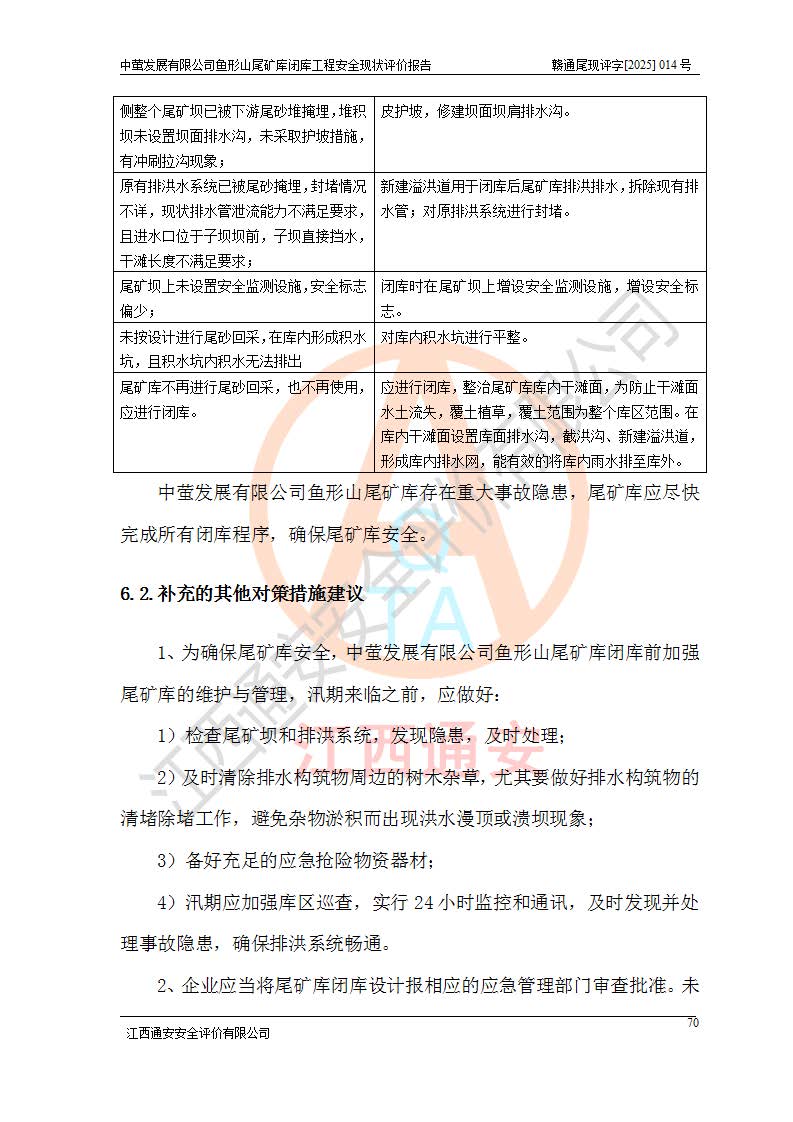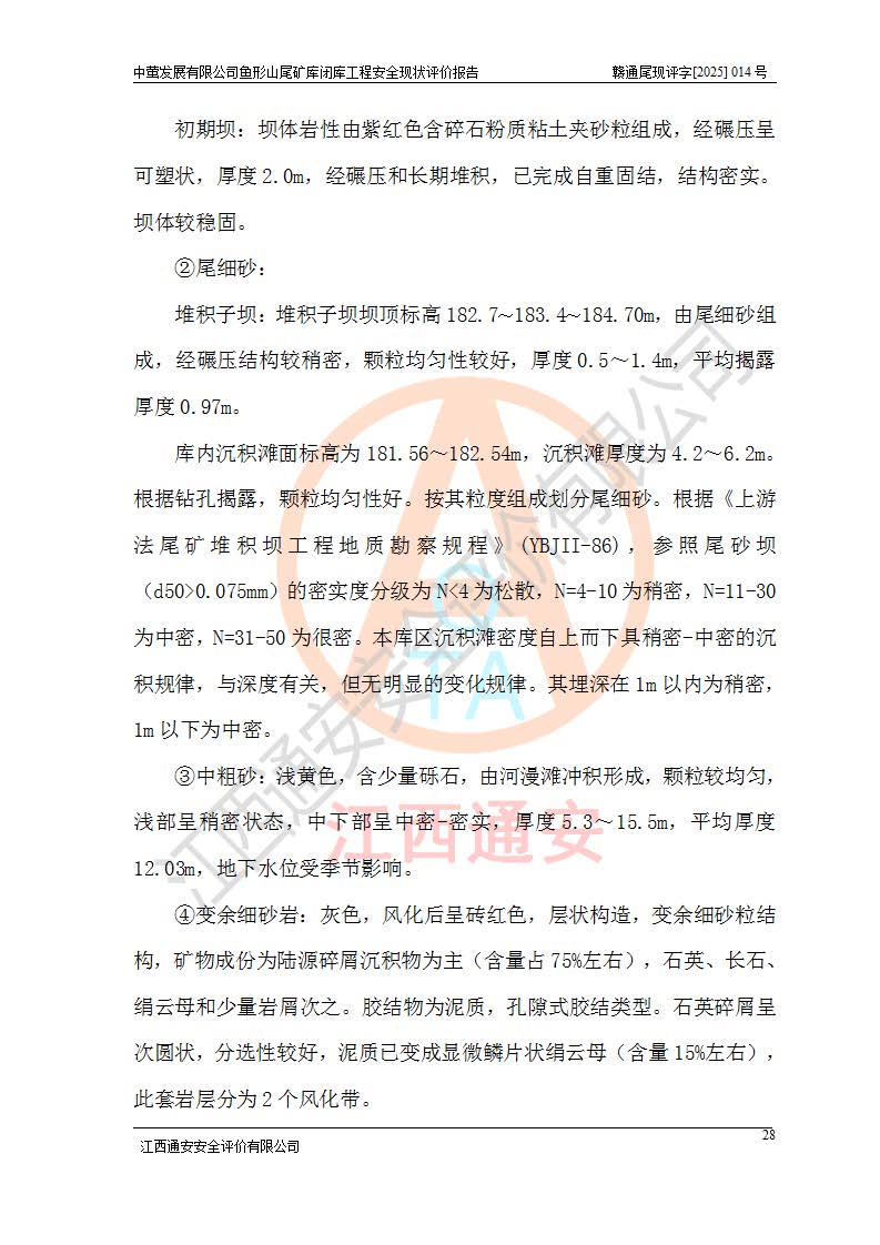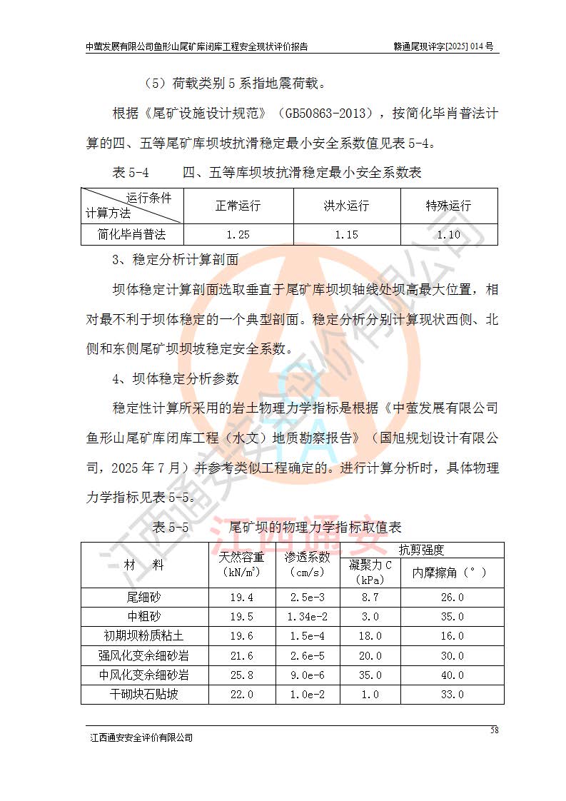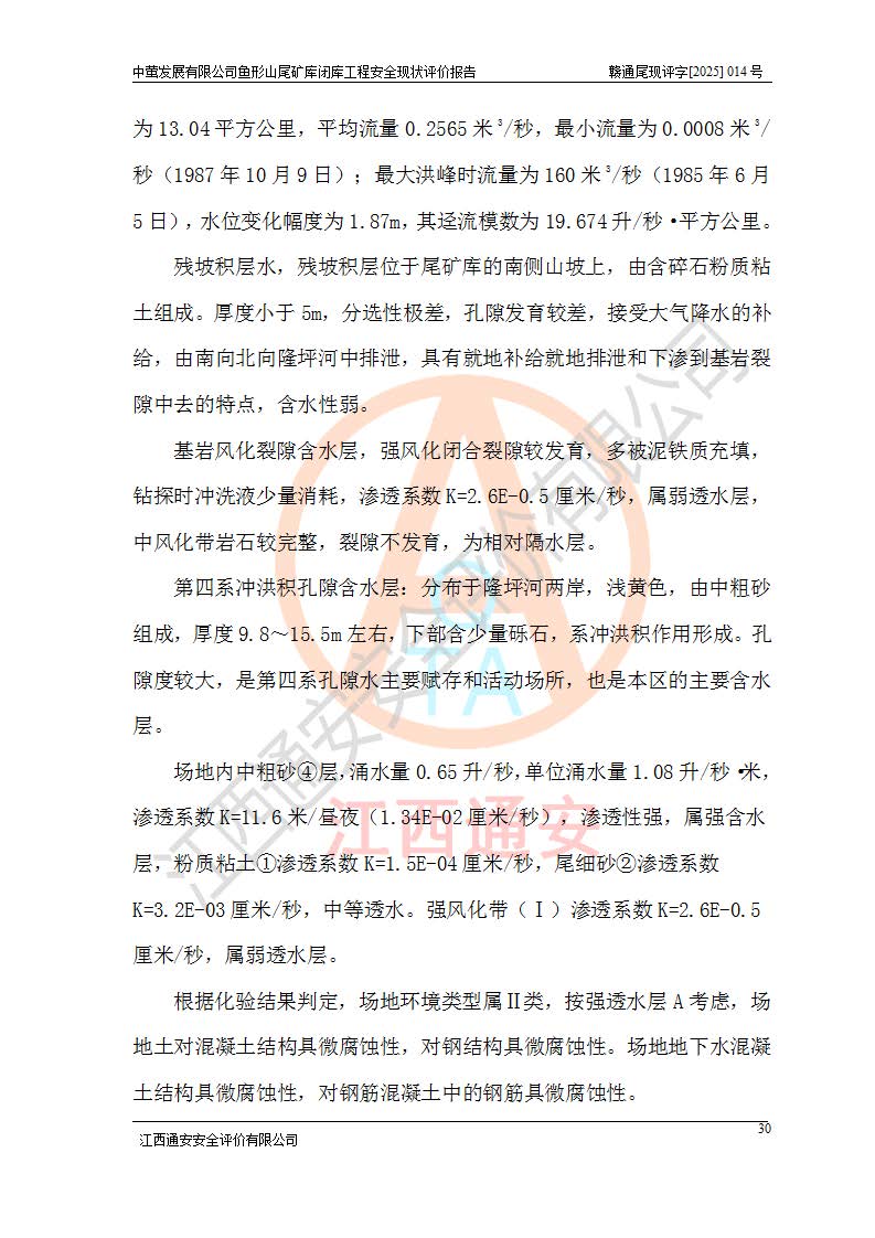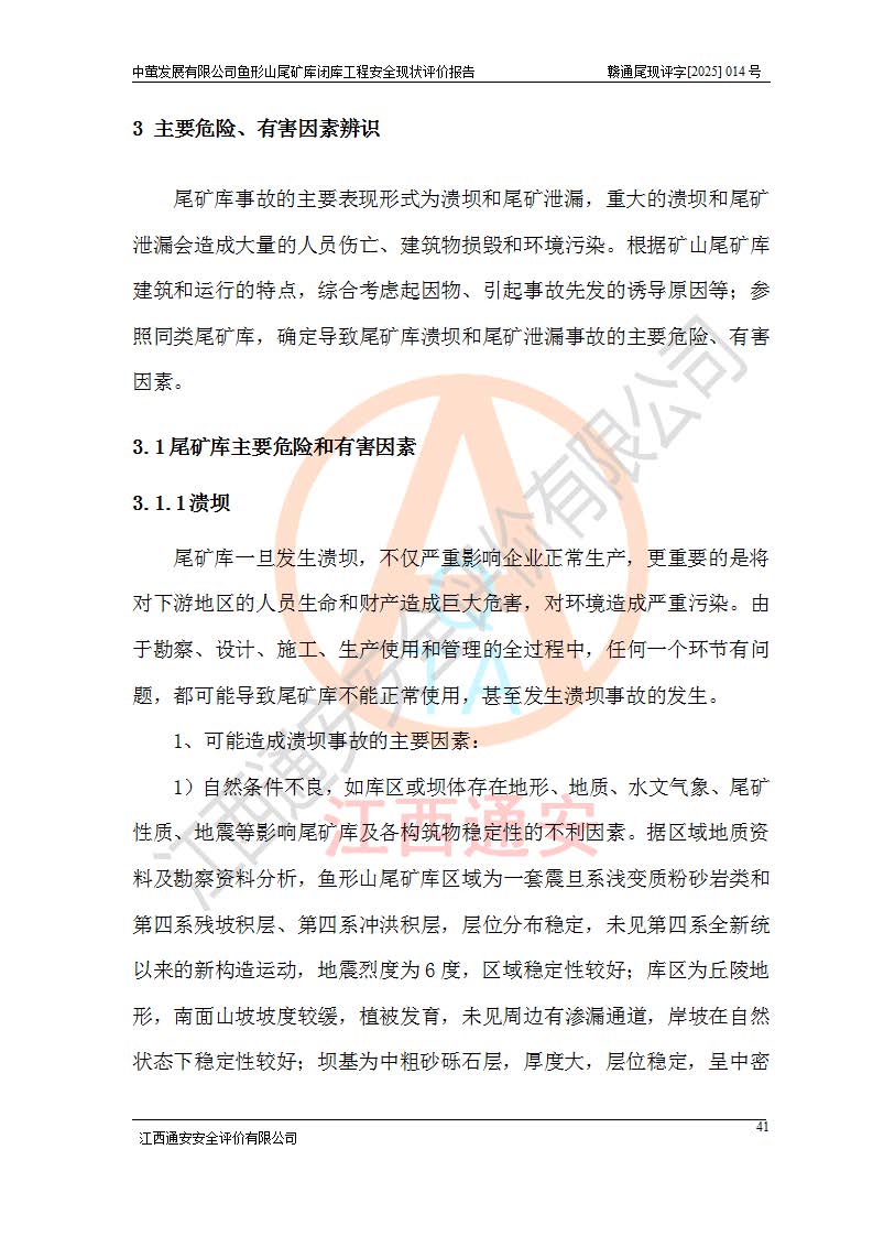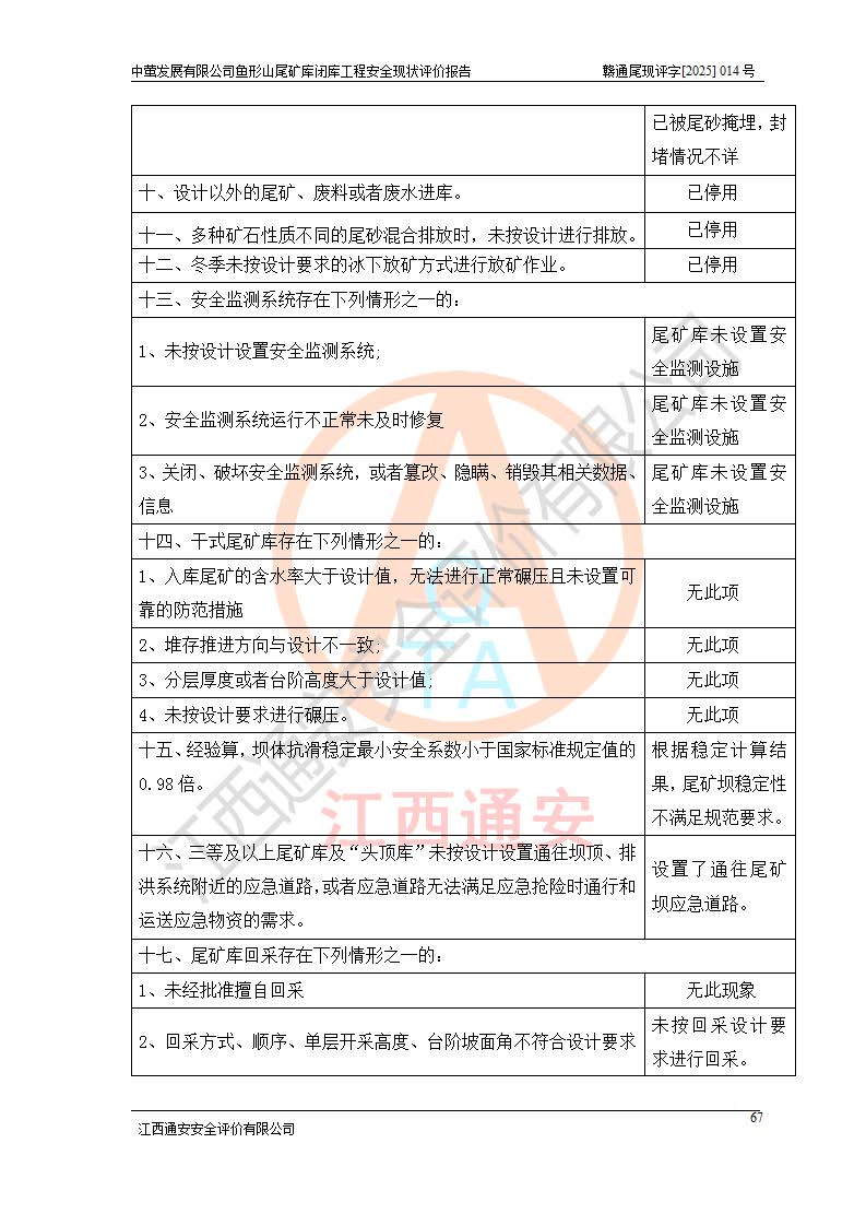存在的問題: 1、初期壩未設(shè)置排水棱體,下游坡比較陡,初期壩壩頂被尾砂掩埋,尾礦壩穩(wěn)定性不滿足規(guī)范要求; 2、堆積壩外坡比較陡,不滿足規(guī)范要求,東側(cè)整個尾礦壩已被下游尾砂堆掩埋,堆積壩未設(shè)置壩面排水溝,未采取護(hù)坡措施,有沖刷拉溝現(xiàn)象; 3、原有排洪水系統(tǒng)已被尾砂掩埋,封堵情況不詳,現(xiàn)狀排水管泄流能力不滿足要求,且進(jìn)水口位于子壩壩前,子壩直接擋水,干灘長度不滿足要求; 4、尾礦壩上未設(shè)置安全監(jiān)測設(shè)施,安全標(biāo)志偏少; 5、未按設(shè)計進(jìn)行尾砂回采,在庫內(nèi)形成積水坑,且積水坑內(nèi)積水無法排出; 6、尾礦庫不再進(jìn)行尾砂回采,也不再使用,應(yīng)進(jìn)行閉庫。 整改措施: 1、在初期壩下游增設(shè)干砌塊石貼坡排水體,增加壩體穩(wěn)定性,在北側(cè)和東側(cè)初期壩壩腳增設(shè)壩腳排水溝。 2、對堆積壩削坡,增加壩體的穩(wěn)定性,削坡后覆土植草皮護(hù)坡,修建壩面壩肩排水溝。 3、新建溢洪道用于閉庫后尾礦庫排洪排水,拆除現(xiàn)有排水管;對原排洪系統(tǒng)進(jìn)行封堵。 4、閉庫時在尾礦壩上增設(shè)安全監(jiān)測設(shè)施,增設(shè)安全標(biāo)志。 5、對庫內(nèi)積水坑進(jìn)行平整。 6、應(yīng)進(jìn)行閉庫,整治尾礦庫庫內(nèi)干灘面,為防止干灘面水土流失,覆土植草,覆土范圍為整個庫區(qū)范圍。在庫內(nèi)干灘面設(shè)置庫面排水溝,截洪溝、新建溢洪道,形成庫內(nèi)排水網(wǎng),能**的將庫內(nèi)雨水排至庫外。 |