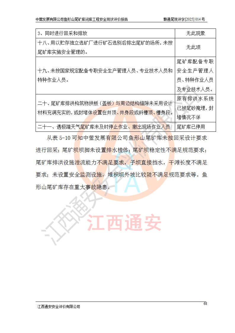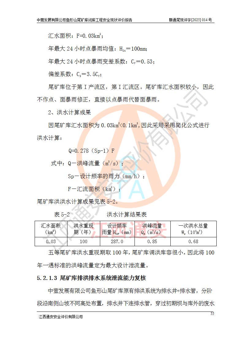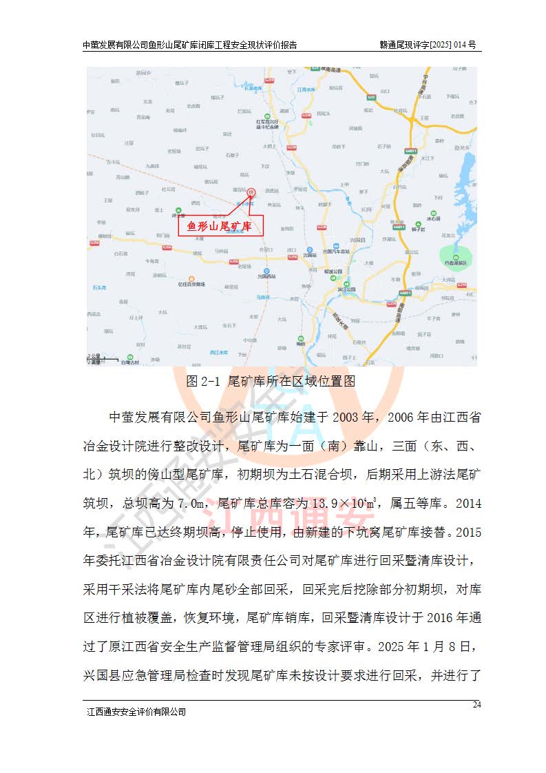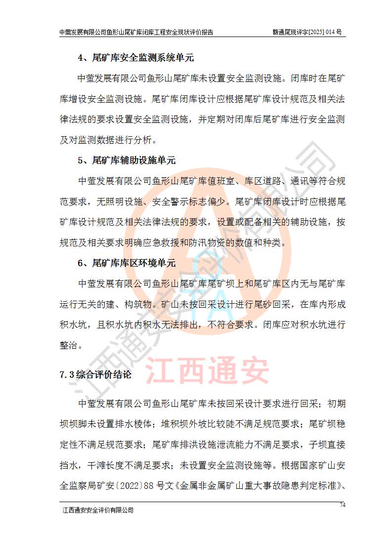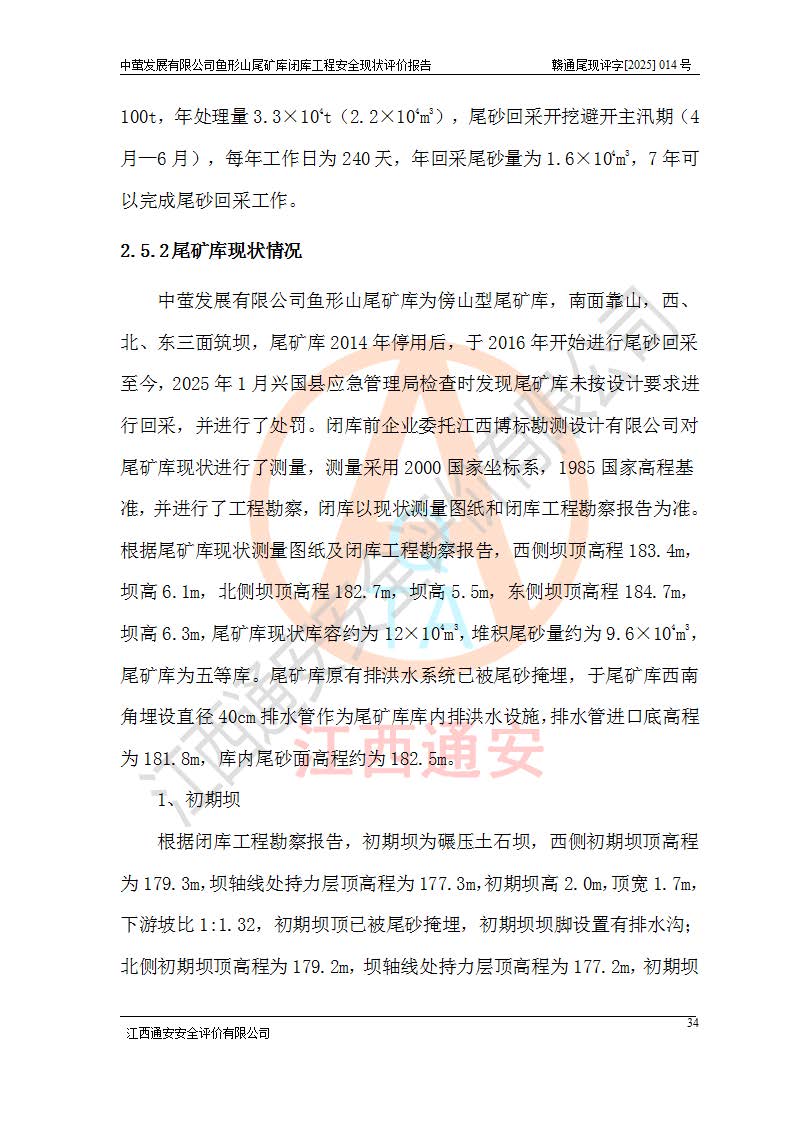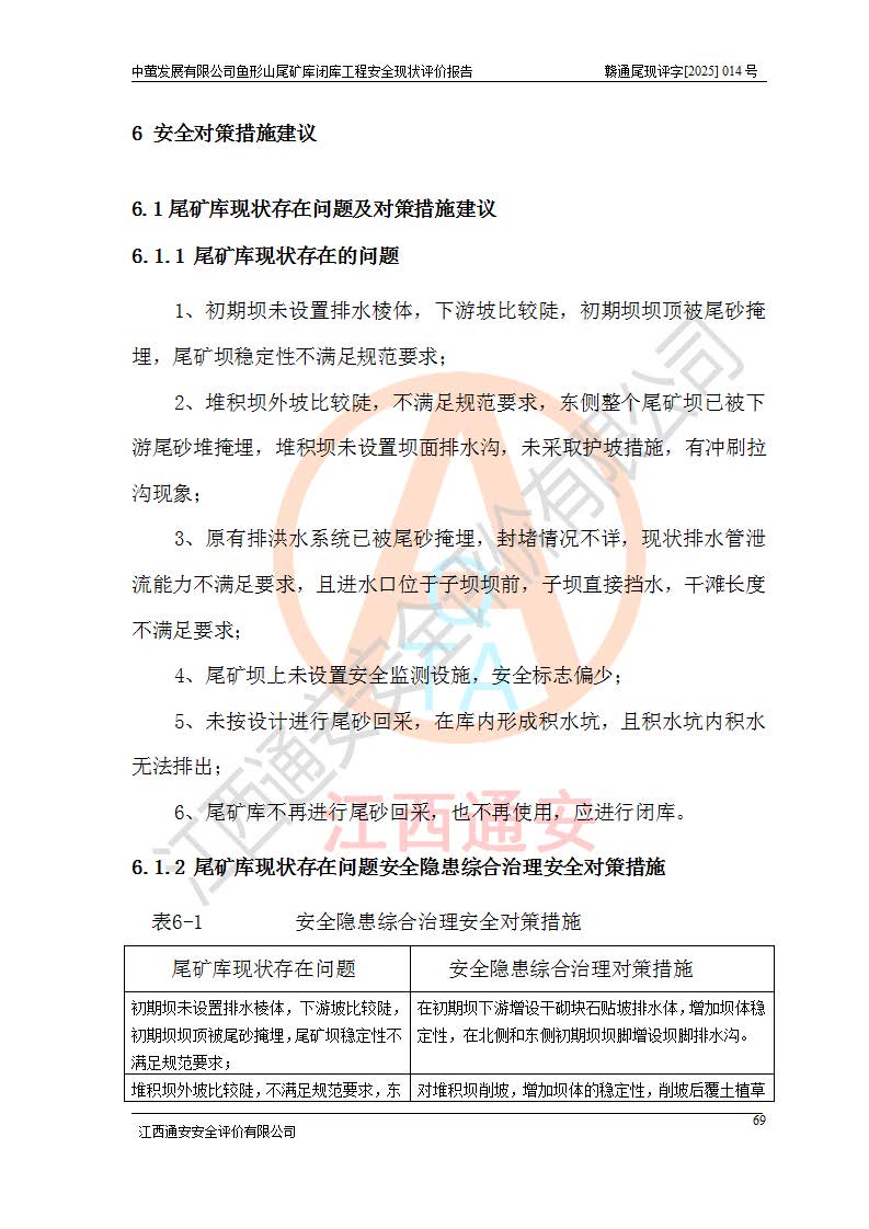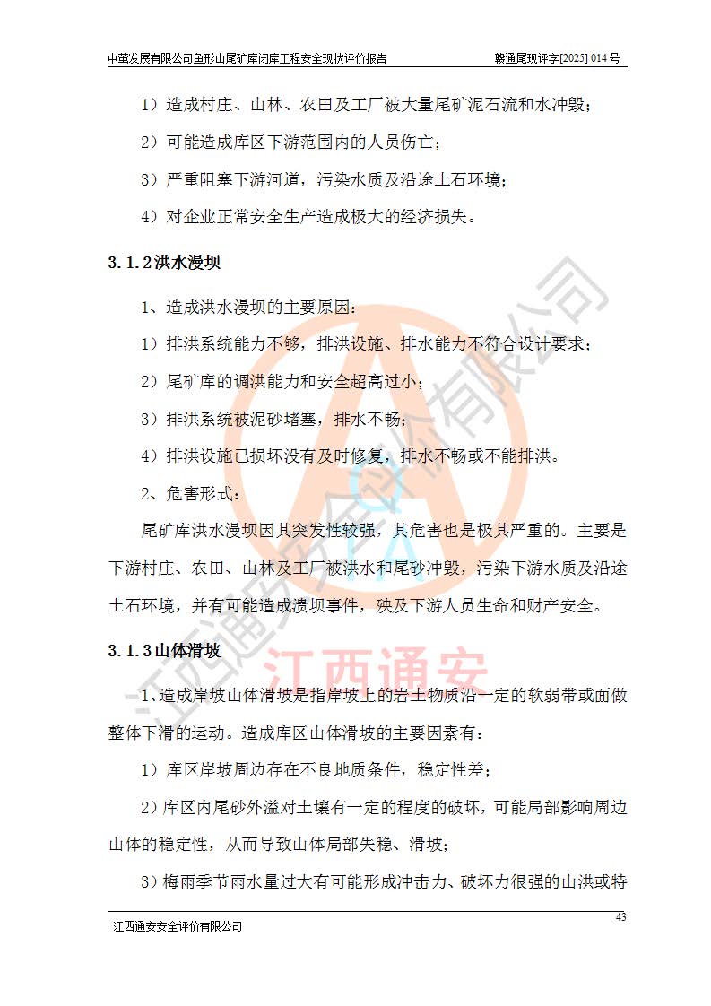 存在的問題: 1、初期壩未設(shè)置排水棱體,下游坡比較陡,初期壩壩頂被尾砂掩埋,尾礦壩穩(wěn)定性不滿足規(guī)范要求; 2、堆積壩外坡比較陡,不滿足規(guī)范要求,東側(cè)整個尾礦壩已被下游尾砂堆掩埋,堆積壩未設(shè)置壩面排水溝,未采取護(hù)坡措施,有沖刷拉溝現(xiàn)象; 3、原有排洪水系統(tǒng)已被尾砂掩埋,封堵情況不詳,現(xiàn)狀排水管泄流能力不滿足要求,且進(jìn)水口位于子壩壩前,子壩直接擋水,干灘長度不滿足要求; 4、尾礦壩上未設(shè)置安全監(jiān)測設(shè)施,安全標(biāo)志偏少; 5、未按設(shè)計進(jìn)行尾砂回采,在庫內(nèi)形成積水坑,且積水坑內(nèi)積水無法排出; 6、尾礦庫不再進(jìn)行尾砂回采,也不再使用,應(yīng)進(jìn)行閉庫。 整改措施: 1、在初期壩下游增設(shè)干砌塊石貼坡排水體,增加壩體穩(wěn)定性,在北側(cè)和東側(cè)初期壩壩腳增設(shè)壩腳排水溝。 2、對堆積壩削坡,增加壩體的穩(wěn)定性,削坡后覆土植草皮護(hù)坡,修建壩面壩肩排水溝。 3、新建溢洪道用于閉庫后尾礦庫排洪排水,拆除現(xiàn)有排水管;對原排洪系統(tǒng)進(jìn)行封堵。 4、閉庫時在尾礦壩上增設(shè)安全監(jiān)測設(shè)施,增設(shè)安全標(biāo)志。 5、對庫內(nèi)積水坑進(jìn)行平整。 6、應(yīng)進(jìn)行閉庫,整治尾礦庫庫內(nèi)干灘面,為防止干灘面水土流失,覆土植草,覆土范圍為整個庫區(qū)范圍。在庫內(nèi)干灘面設(shè)置庫面排水溝,截洪溝、新建溢洪道,形成庫內(nèi)排水網(wǎng),能**的將庫內(nèi)雨水排至庫外。 |